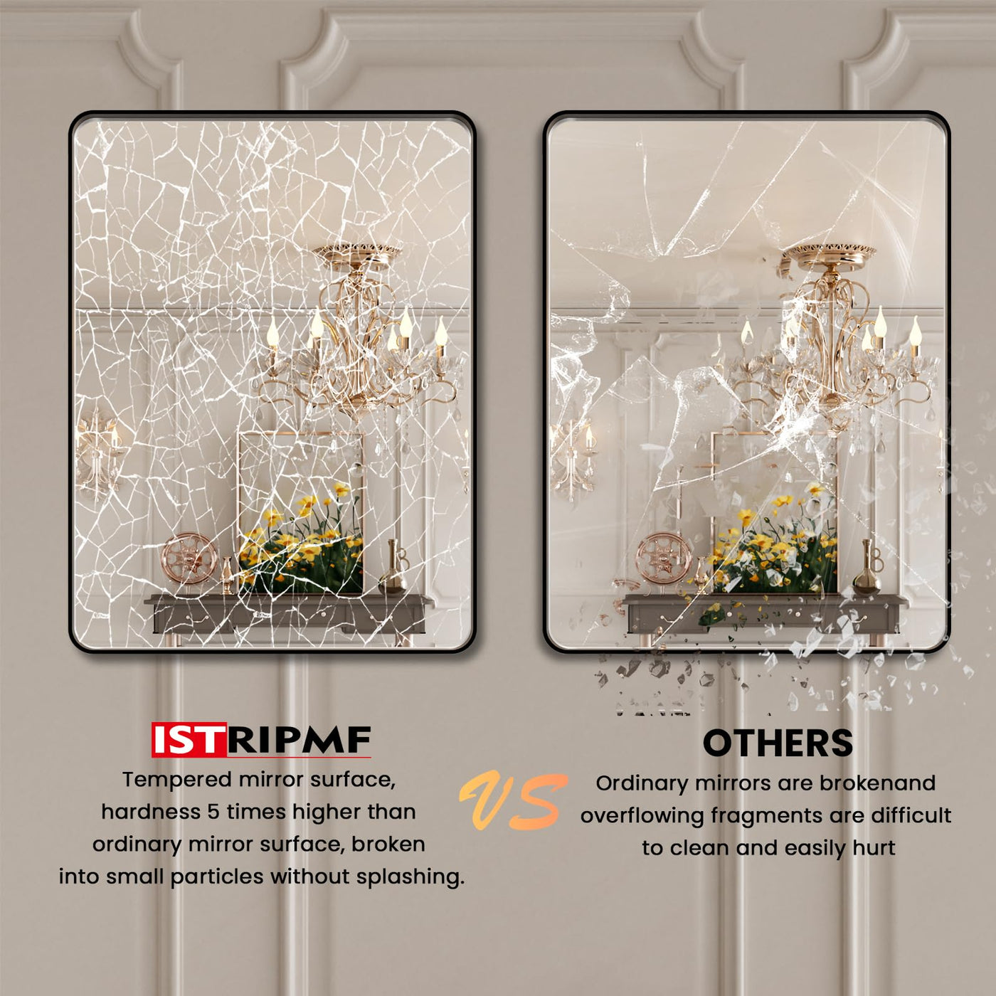 Q: What materials are used in the construction of this bathroom mirror?A: This bathroom mirror features a high-grade aluminum alloy frame with a round corner design and is made from 4mm safety tempered glass, ensuring durability and safety.