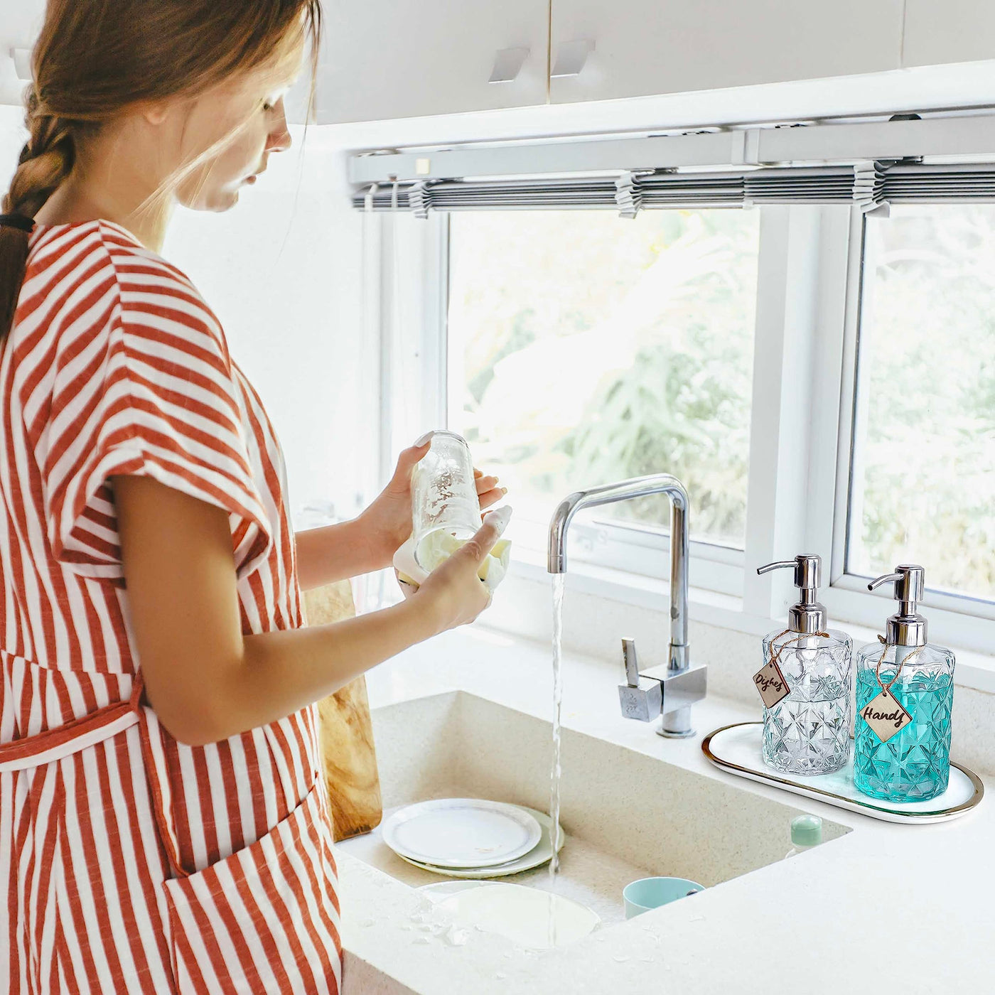 Q: Can the glass soap dispenser be customized?A: Absolutely! The JASAI soap dispenser comes with a rustic wooden tag that you can customize with your own content, adding a personal decorative touch to your kitchen or bathroom.