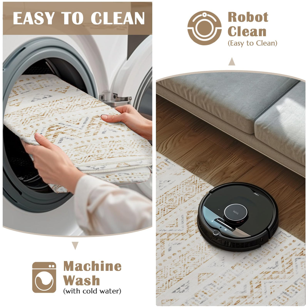 Q: How do I care for and clean the jinchan area rug?A: The jinchan area rug is machine washable, allowing for easy cleaning. For regular maintenance, you can also use a vacuum cleaner, broom, or wipe. To remove initial creases, simply roll the rug up from the corners and let it sit for a day or two, or iron the backside.