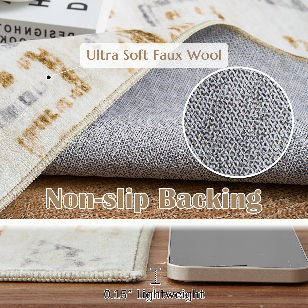 Q: What makes the jinchan Boho area rug suitable for high traffic areas?A: The jinchan Boho area rug is designed with premium materials that are both thin and sturdy, making it ideal for high traffic areas. Its non-slip backing ensures safety and stability, making it a great choice for homes with kids and pets.
