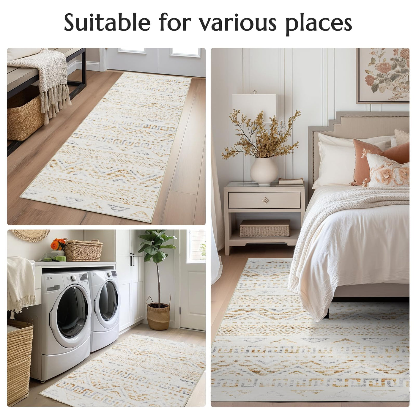 Q: Can this rug be used in different rooms of the house?A: Yes, the versatile design of the jinchan Boho area rug makes it suitable for various rooms, including the living room, bedroom, dining area, and even nurseries. It adds both comfort and a stylish focal point to any space.