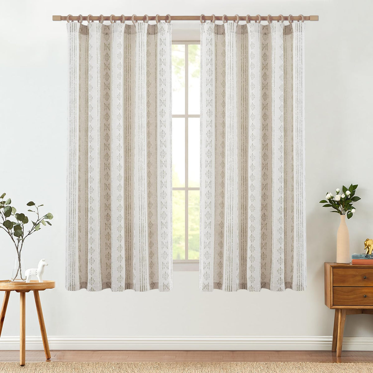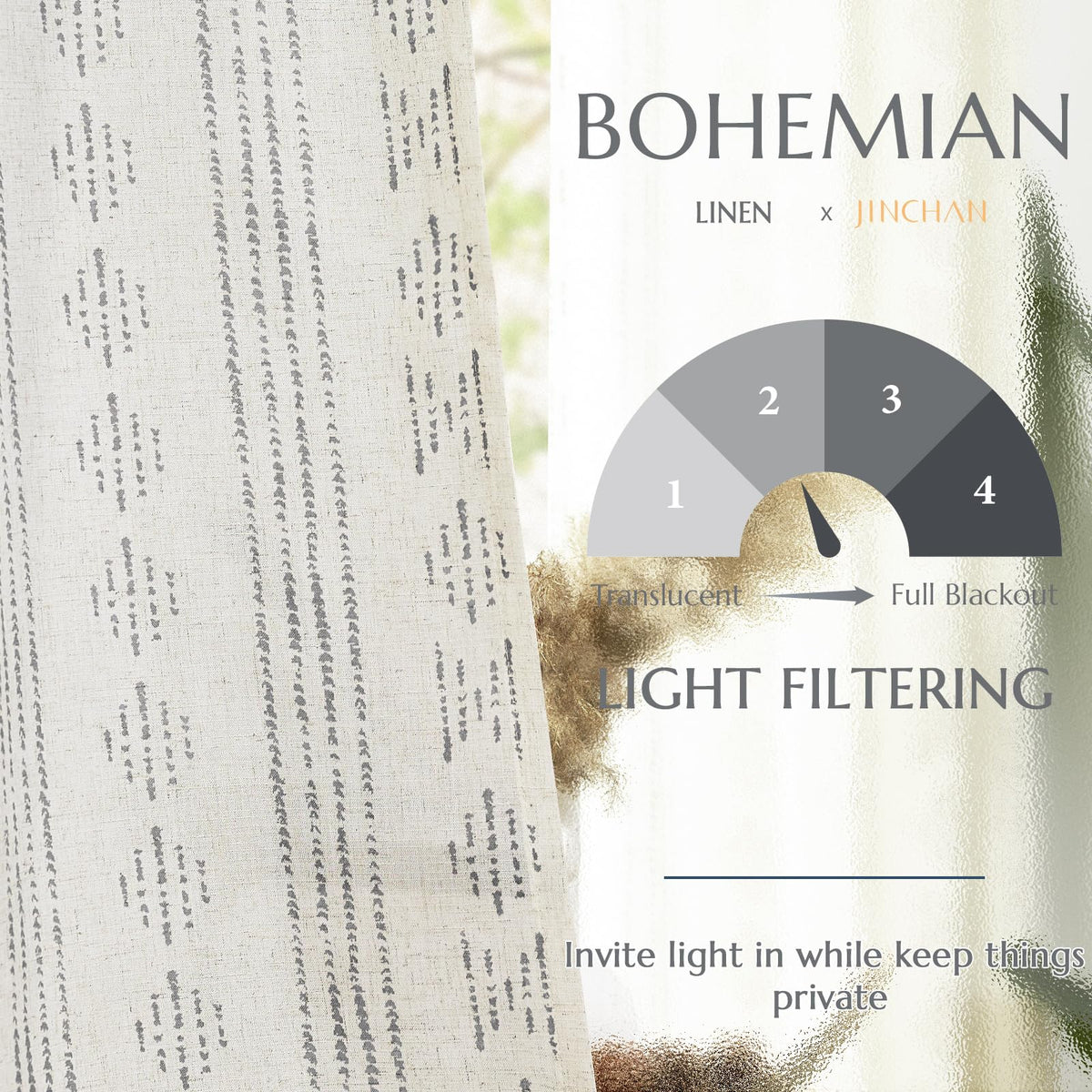 JINCHAN curtains in your house! Ready Made:These linen blend curtains adds a bohemian art to your windows. 2 panels included. Warm up your space with the natural look and feel of JINCHAN curtains. Boho Design:Bringing boho-chic style to your room, these curtains with strips in different length boasts a sea-breeze look and global pattern. Pull together the decor in your house or bring an easygoing feel to an indoor space. Versatile Use:Letting in just the right light, these classic curtains in a variety of colors act as a light filter and provide refreshing feel to the room. They work well for your bedroom and living room. Hanging Option:These elegant window curtains with 1.6 inch inner diameter grommet top can work easily with most regular curtain rods. The antique bronze grommet top is easy to install, smooth to draw. Easy Care:Our linen textured curtains are durable and long lasting with sturdy fabric and top-quality stitching. They can withstand machine wash in cold water and tumble dry in gentle setting, no bleach.