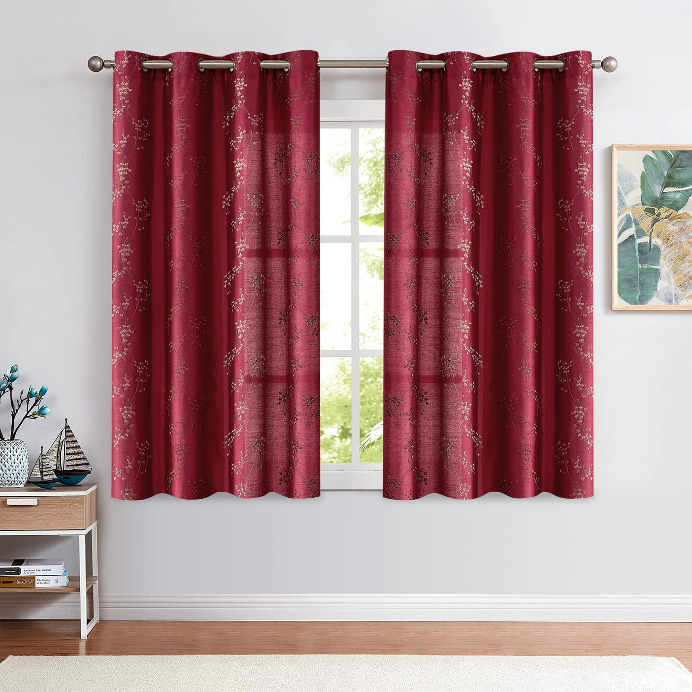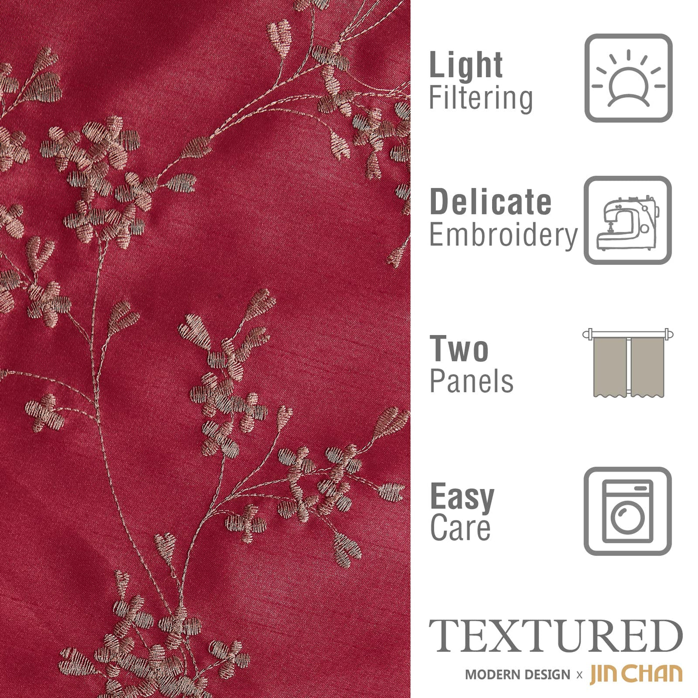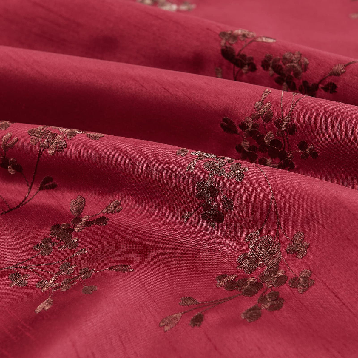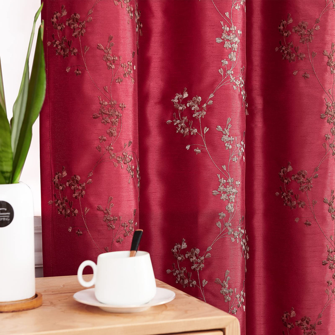 Jinchan Floral Curtains Embroidered Curtains For Living Room 63 Inch Length Faux Silk Curtains Burgundy Red Flower Patterned Dra