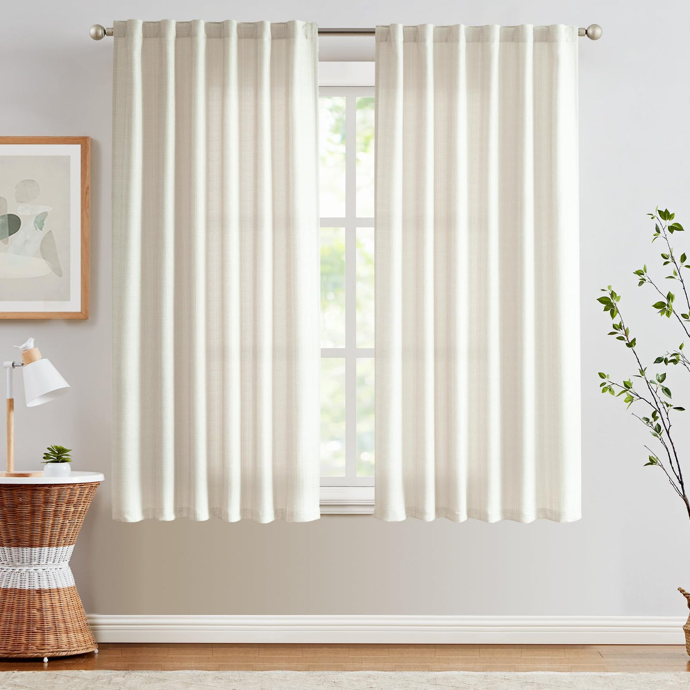 Q: What style of rooms do these curtains complement?A: The simple and elegant design of these linen textured curtains makes them suitable for various settings, including living rooms, bedrooms, dining rooms, and kitchens.