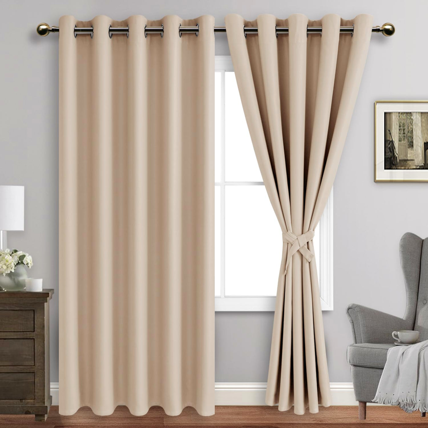 Jiuzhen Beige Blackout Curtains With Tiebacks - Thermal Insulated, Light Blocking And Noise Reducing Grommet Curtains For Bedroom And Living Room, Set Of 2 Window Curtain Panels, 60 X 84 Inch Length