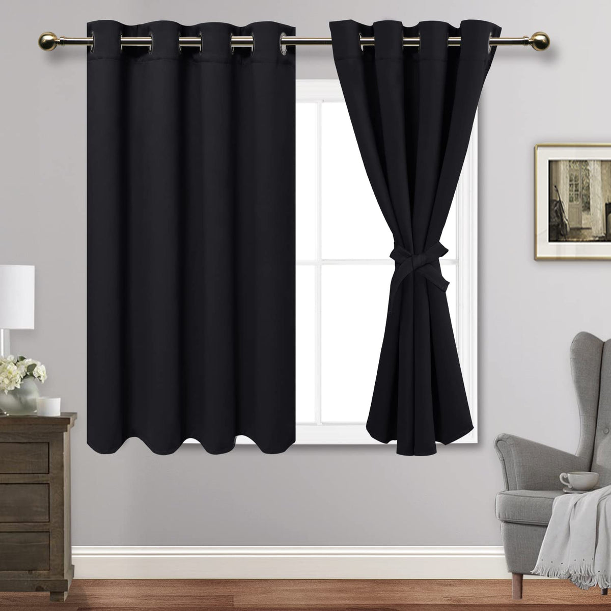 Jiuzhen Black Blackout Curtains With Tiebacks - Thermal Insulated, Light Blocking And Noise Reducing Grommet Curtains For Bedroom And Living Room, Set Of 2 Window Curtain Panels, 52 X 45 Inch Length