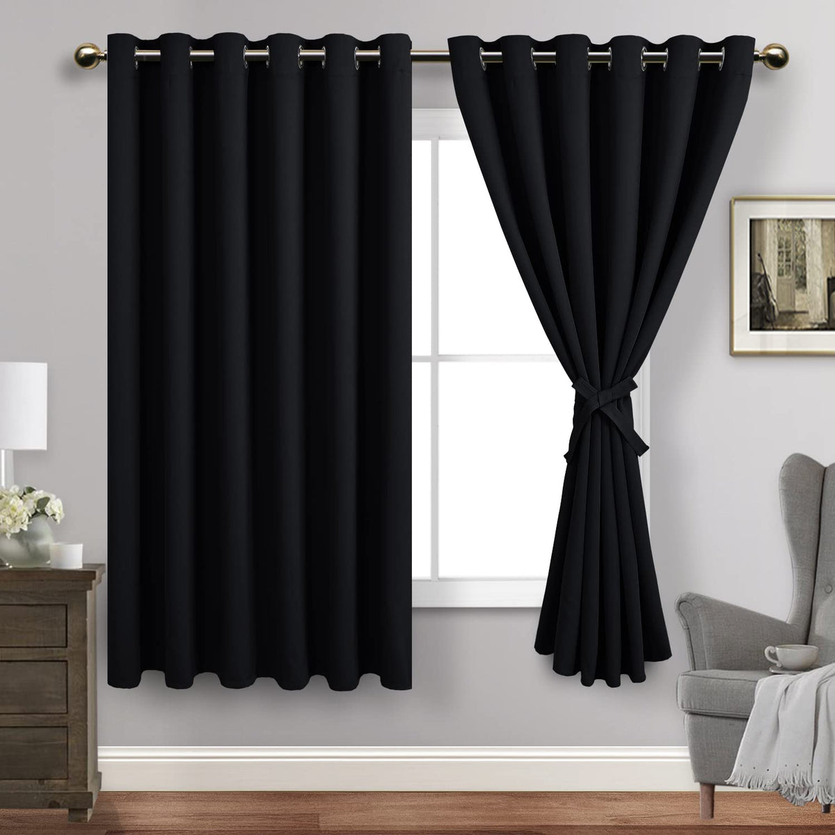 Jiuzhen Black Blackout Curtains With Tiebacks - Thermal Insulated, Light Blocking And Noise Reducing Grommet Curtains For Bedroom And Living Room, Set Of 2 Window Curtain Panels, 70 X 63 Inch Length