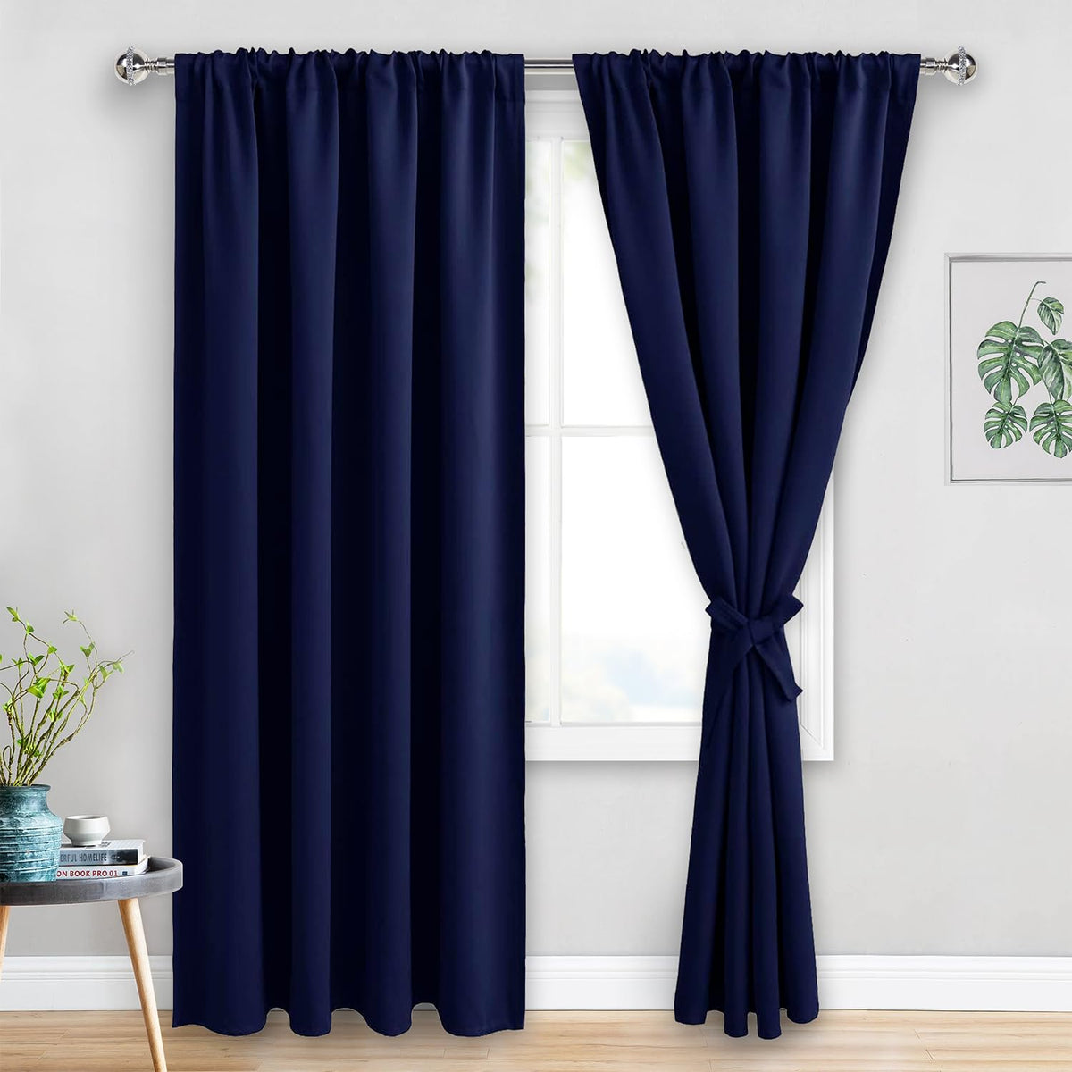 Jiuzhen Blackout Curtains For Bedroom - Thermal Insulated Room Darkening Rod Pocket Curtains For Living Room, Set Of 2 Panels With Tiebacks, 52 X 96 Inch Length, Navy Blue