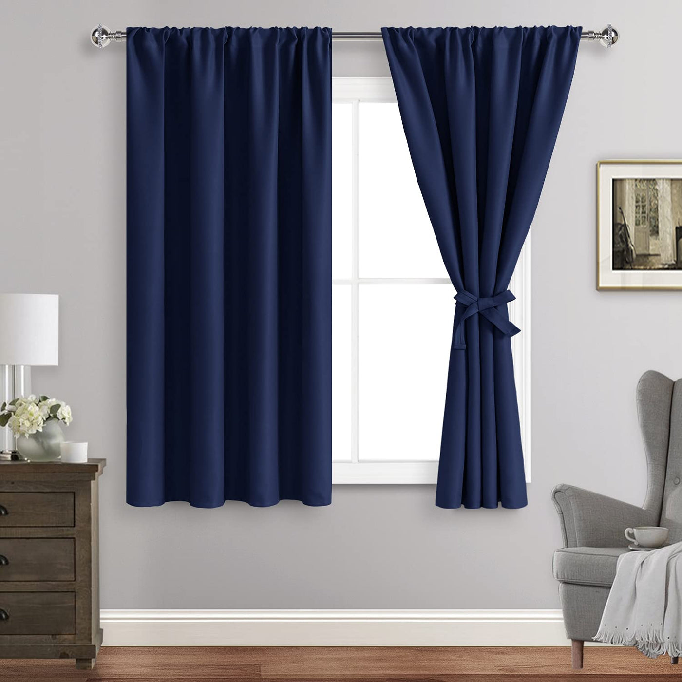Jiuzhen Blackout Curtains For Bedroom - Thermal Insulated Room Darkening Rod Pocket Short Curtains For Living Room, Set Of 2 Panels With Tiebacks, 42 X 45 Inch Length, Navy Blue