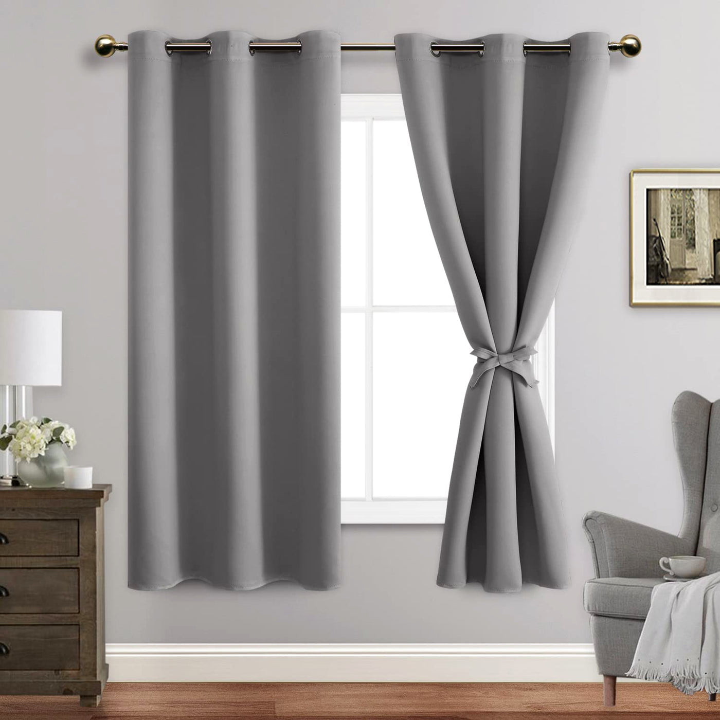 Jiuzhen Blackout Curtains With Tiebacks - Thermal Insulated, Light Blocking And Noise Reducing Grommet Curtain Drapes For Bedroom And Living Room, Set Of 2 Panels, 42 X 63 Inch Length, Light Grey