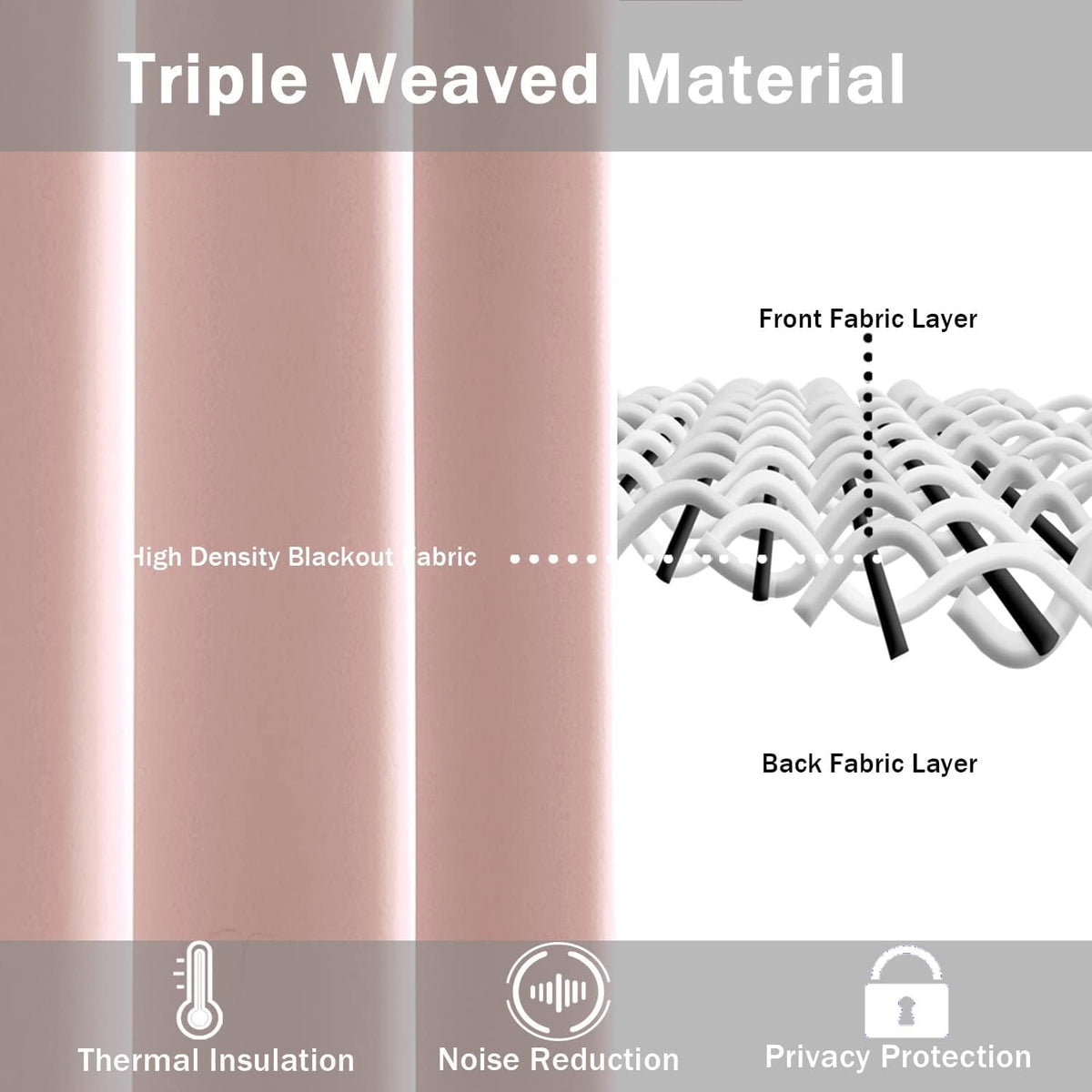 Q: How do the thermal insulation properties of these curtains work?A: These curtains are designed with triple weave technology, which not only blocks out light effectively but also provides thermal insulation, helping to maintain a comfortable temperature in your room by keeping it cool in summer and warm in winter.