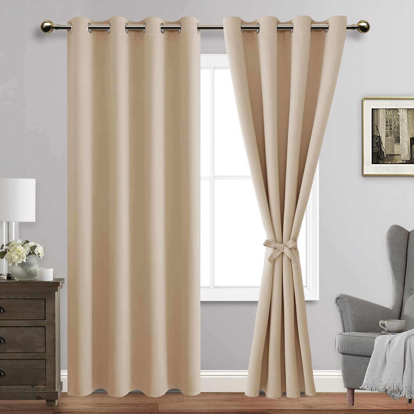 Jiuzhen Blackout Curtains With Tiebacks - Thermal Insulated, Light Blocking And Noise Reducing Grommet Curtain Drapes For Bedroom And Living Room, Set Of 2 Panels, Beige, 52 X 84 Inch Length