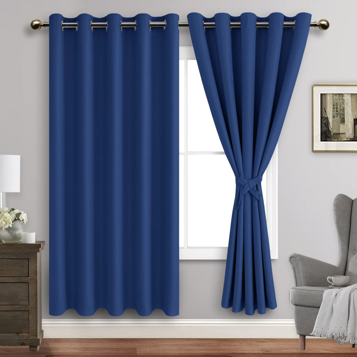 Jiuzhen Classic Blue Blackout Curtains With Tiebacks Thermal Insulated, Light Blocking And Noise Reducing Grommet Curtains For And Living Room, Set Of 2 Window Curtain Panels, 60 X 72 Inch Length