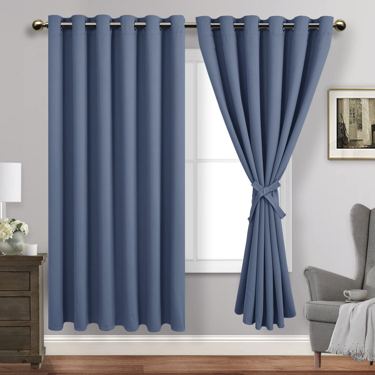 Jiuzhen Dusty Blue Blackout Curtains With Tiebacks Thermal Insulated,Light Blocking And Noise Reducing Grommet Curtains For Bedroom And Living Room, Set Of 2 Window Curtain Panels, 70 X 72 Inch Length