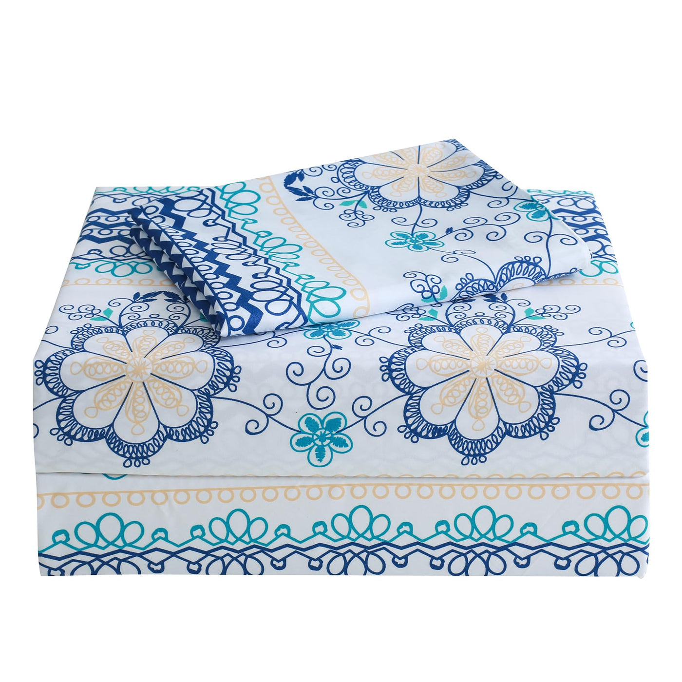 Jsd Blue Boho Printed Sheet Set Twin Size, 3 Piece Soft Floral Microfiber Sheets Extra Deep Pocket Wrinkle Free