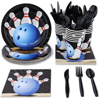 Q: What items are included in the Juvale Kids Bowling Birthday Party Supplies set?A: The Juvale Kids Bowling Birthday Party Supplies set includes a complete collection for 24 guests, featuring 24 plastic knives, spoons, forks, paper plates, napkins, and cups, all designed with a fun bowling theme.