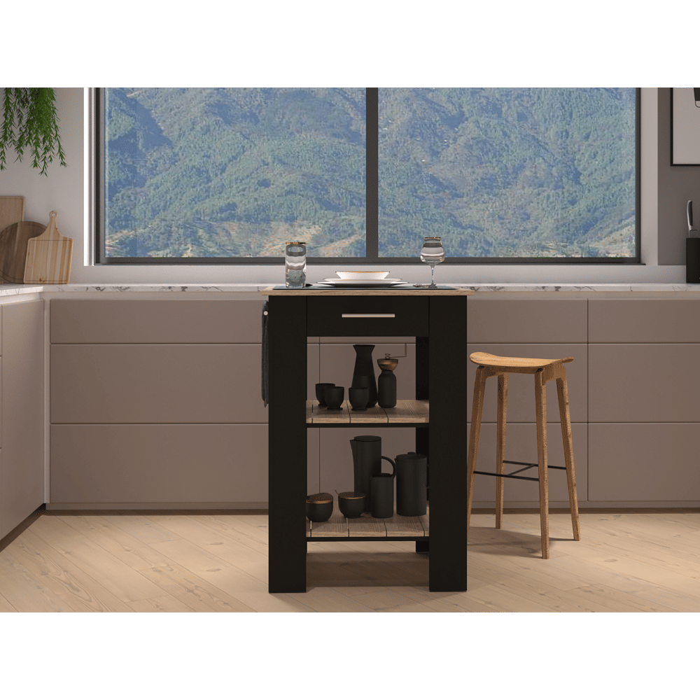 Kitchen Island 37" H, 2-Open Storage Shelves, 1-Drawer, Towel Hanger, Black/Light Oak