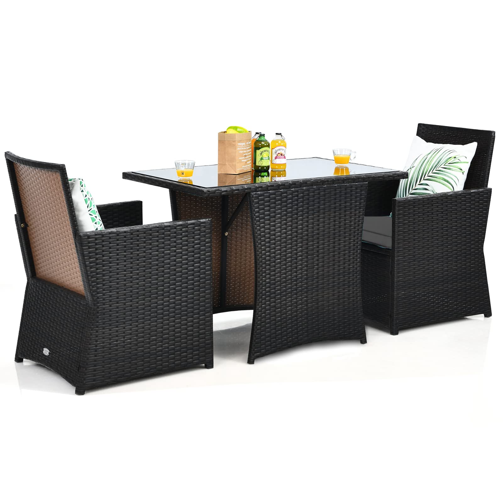 Kotek 3 Piece Outdoor Dining Set, Pe Rattan Dining Table & Chairs Set With Tempered Glass Top & Cushions, Wicker Conversation Set, Patio Bistro Set For Backyard Garden Porch (Grey)