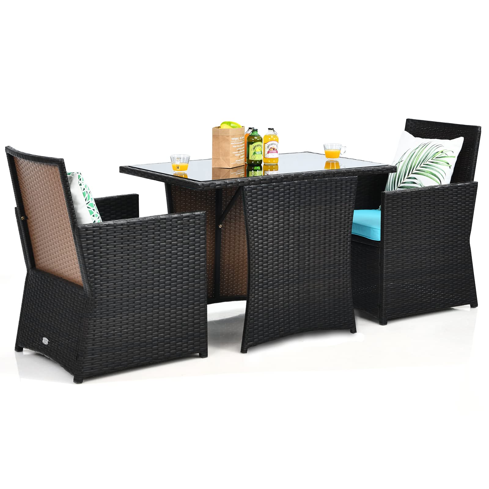 Kotek 3 Piece Outdoor Dining Set, Pe Rattan Dining Table & Chairs Set With Tempered Glass Top & Cushions, Wicker Conversation Set, Patio Bistro Set For Backyard Garden Porch (Turquoise)