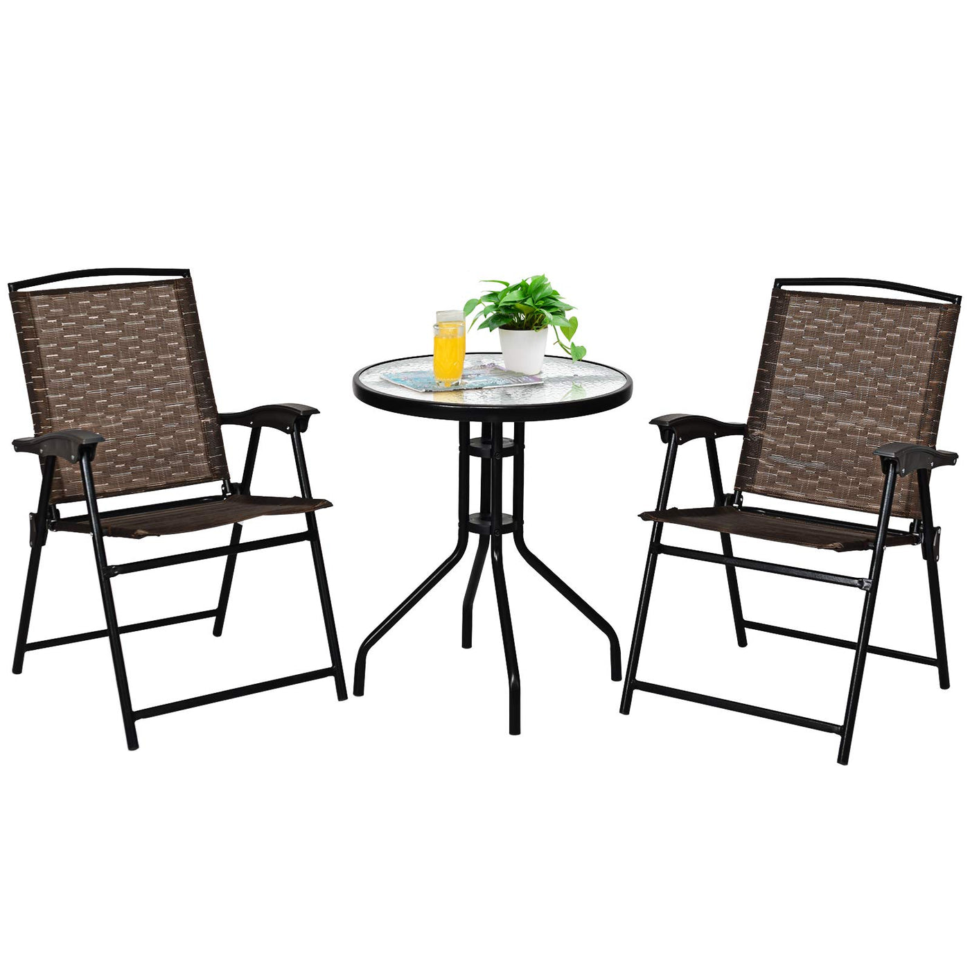 Enjoy Your Leisure Time With Kotek Patio Bistro Set. This Beautiful Outdoor Furniture Set Adds A Stylish And Artful Touch To Your Patio, Porch Or Courtyard. Made Of Heavy-Duty Steel, The Table And Chairs Are Sturdy And Durable. Two Folding Chairs Are Easy For Storage And Transport. Enjoy Meals, Drinks On This Bistro Set And Have A Good Leisure Time With Your Family Or Friends.