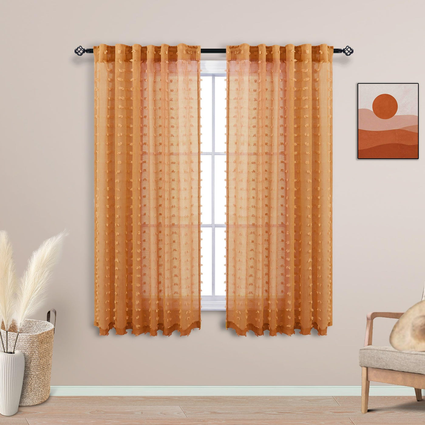 Koufall 52X45 Inches Long Burnt Orange Back Tab Rod Pocket Pom Pom Sheer Curtains For Living Room