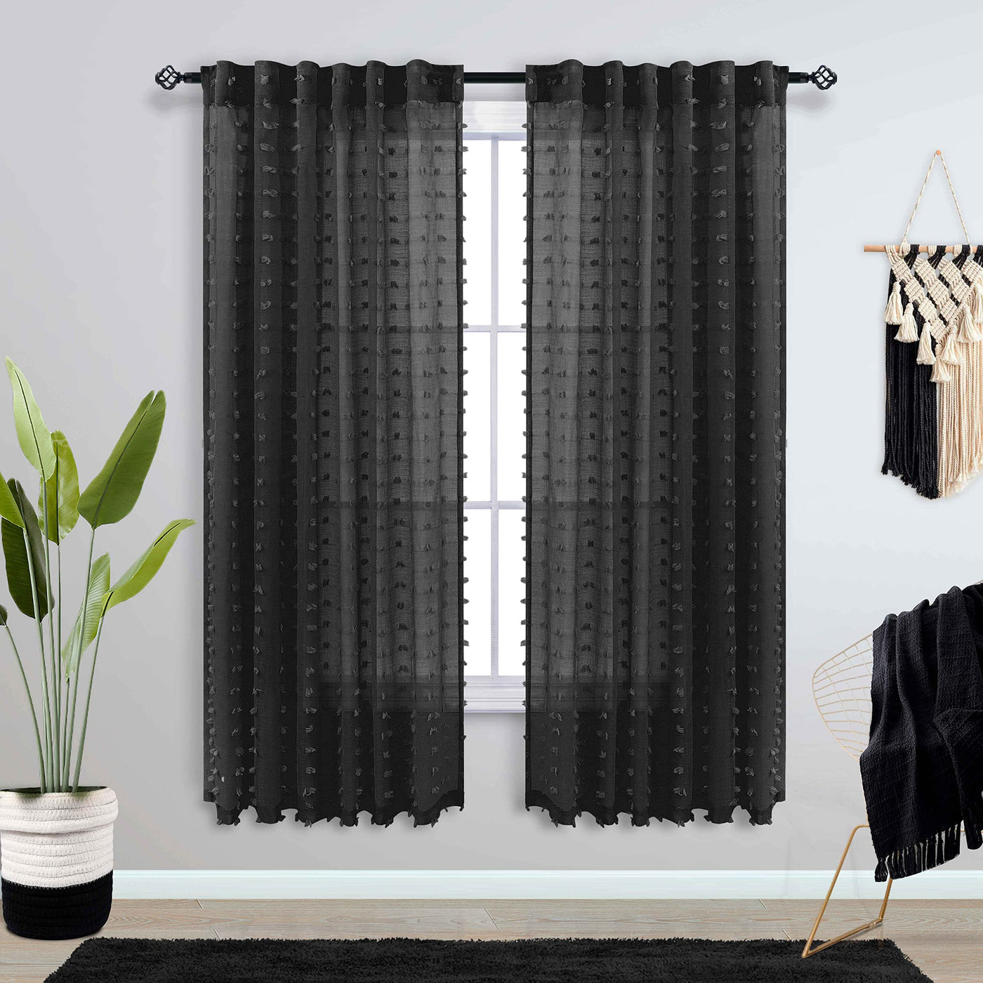 Koufall Black Curtains For Window Bedroom 63 Inch Length 2 Panels Set Lace Pom Pom Back Tab Rod Pocket Modern Chic Semi Sheer Black Curtains For Living Room Dining Room