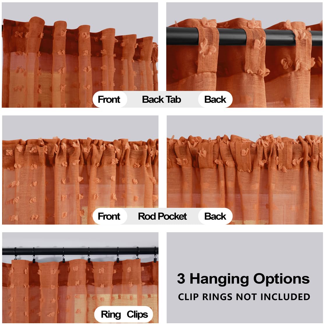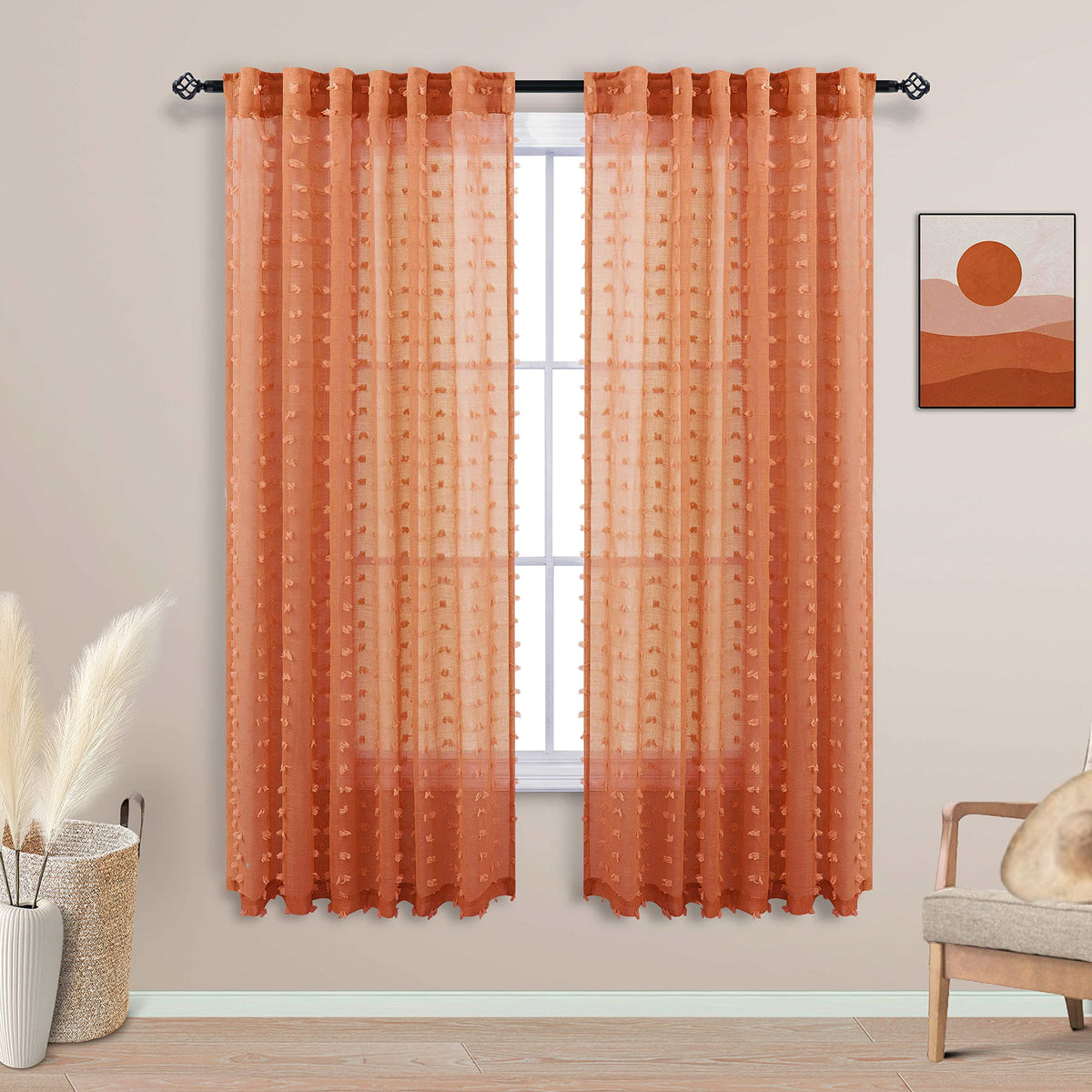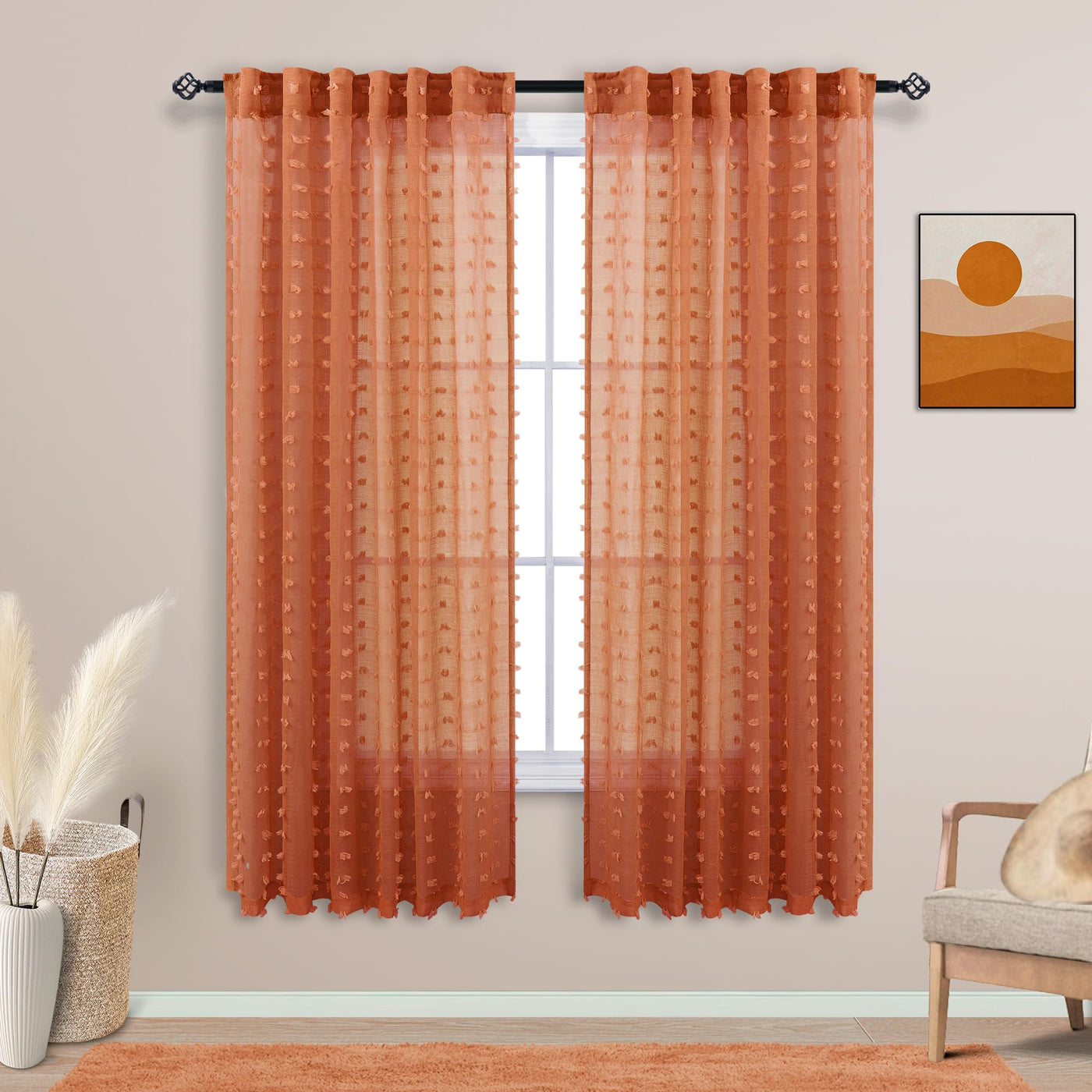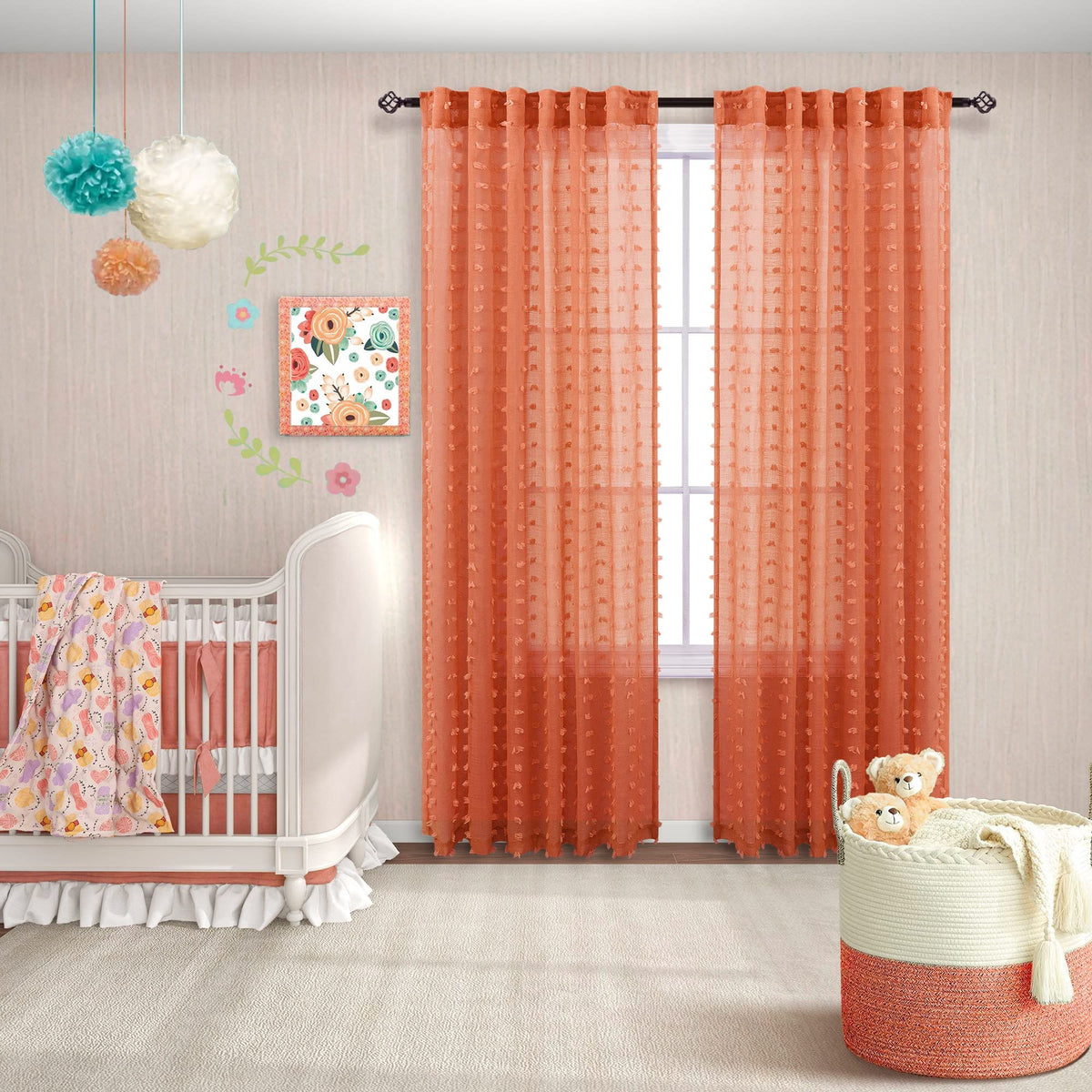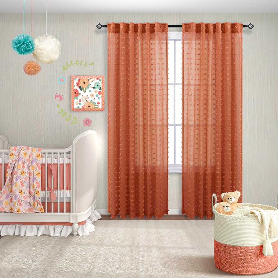 Koufall Orange Boho Curtains 63 Inch Length For Nursery 2 Panels Faux Butterfly Pom Pom Tufted Floral Sheer Curtain For Bedroom