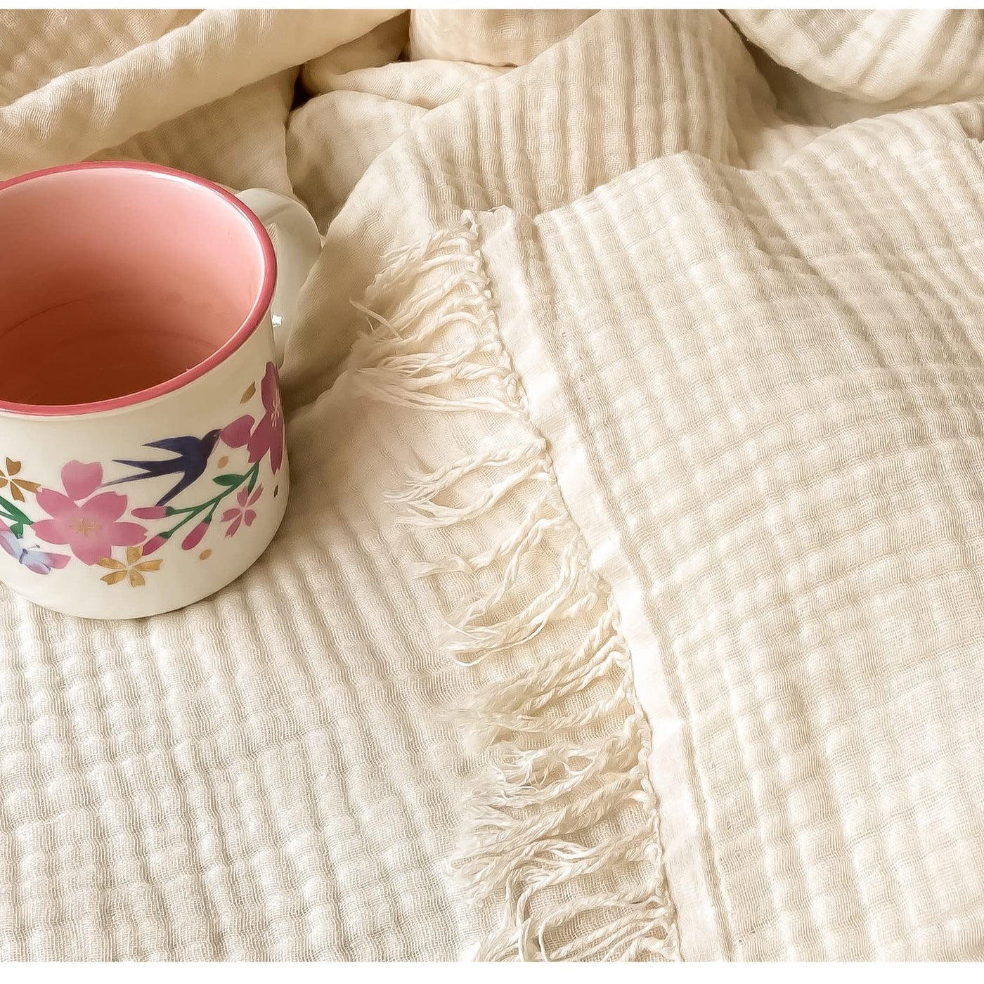 Our New 2024 Light Beige/Ivory/Light Apricot/Creamy/Shortbread Color Right Here This Summer. . Stay Cozy And Comfortable While Making A Difference With Our 4 Layers Organic Cotton Throw Blanket With 2 Side Fringe! This Blanket Is Natural, Soft And Durable. With Its Natural Color And Classic Design, It'S The Perfect Addition To Any Room In Your Home