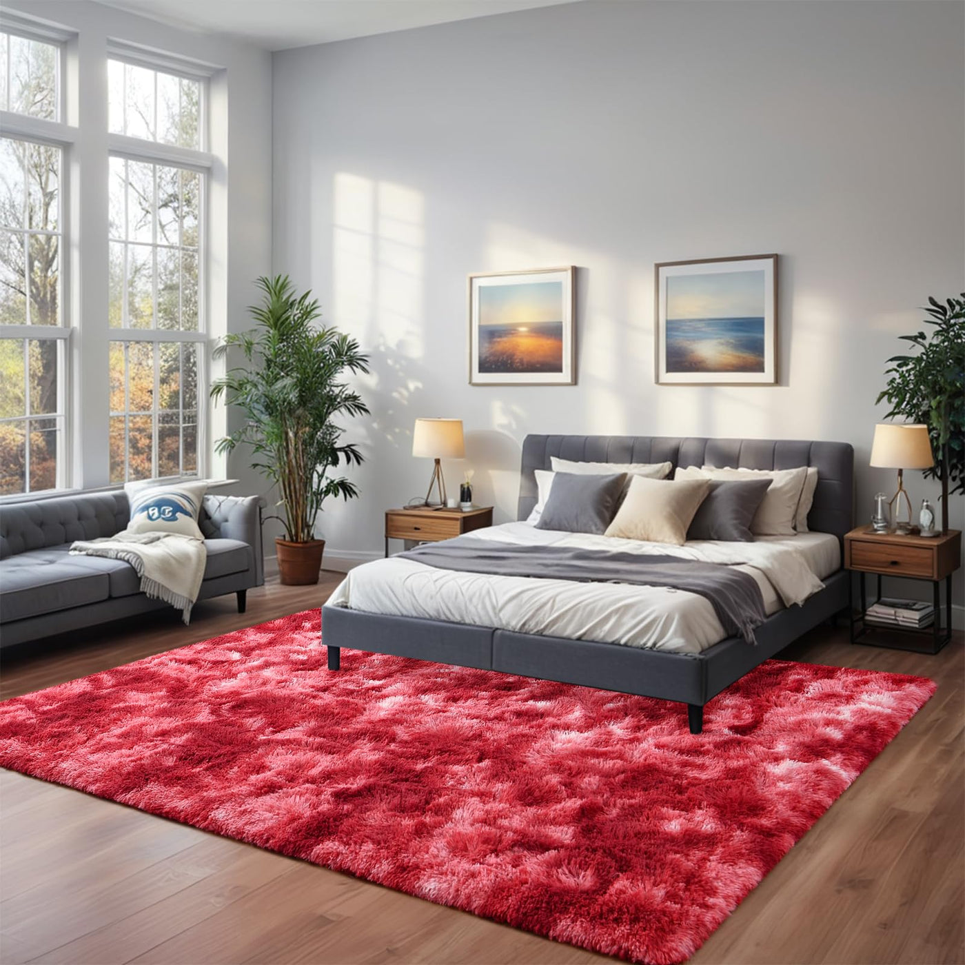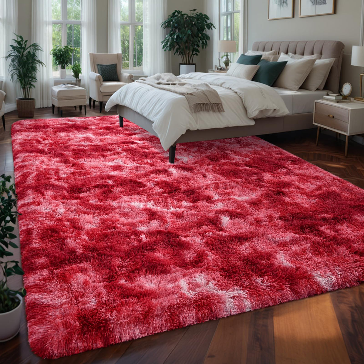 Larhom Fluffy Shag Area Rug, 6X9 Ft Burgundy Red Tie-Dyed Shaggy Fuzzy Carpets For Living Room, Ultra Soft Plush Rugs For Bedroo