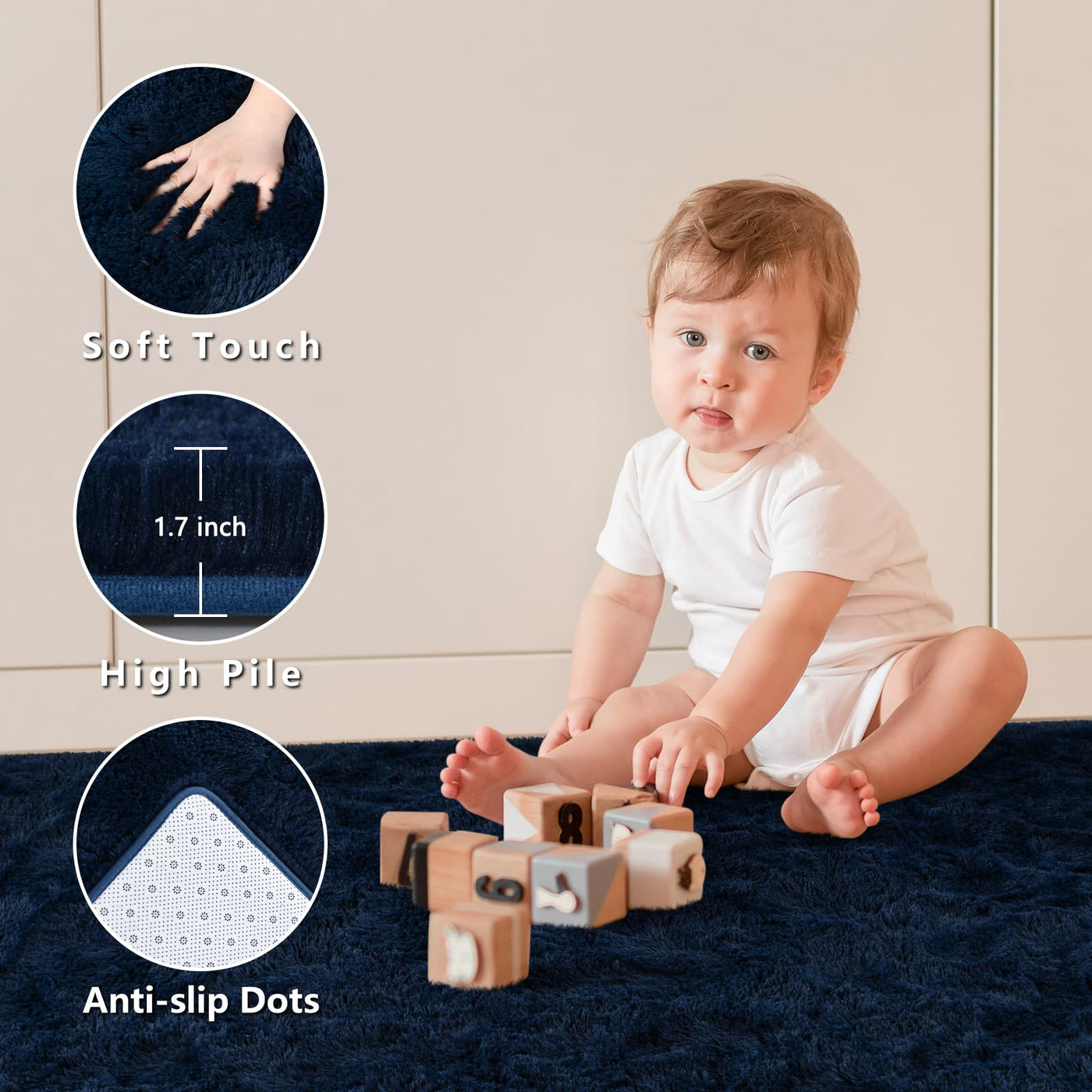 Larhom Large Fluffy Shag Area Rug For Living Room, 6X9 Ft Navy Blue Fuzzy Plush Rugs For Kids Girls Boys Room, Nursery Dorm Room