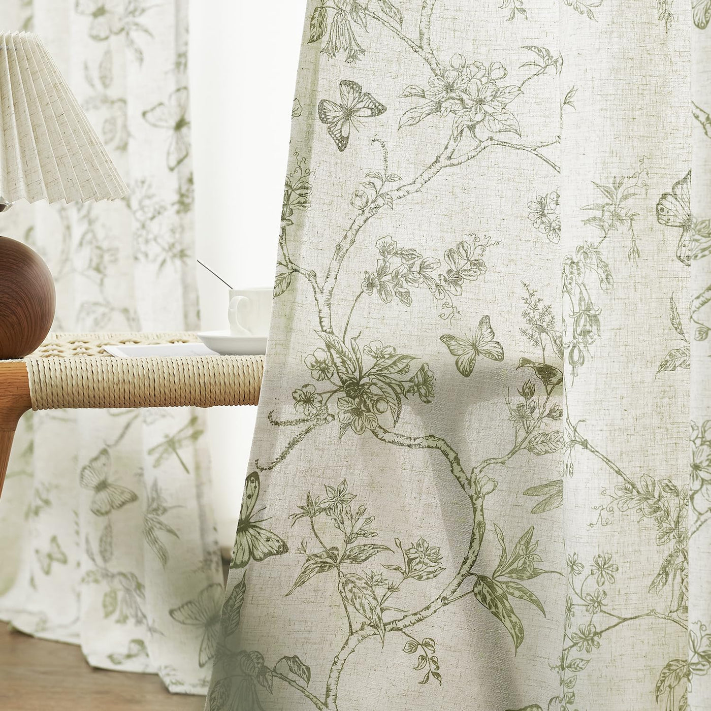 Lazzzy Farmhouse Linen Curtains Green Floral Curtains 108 Inch Length Back Tab Drapes For Living Room Bedroom Light Filtering Co