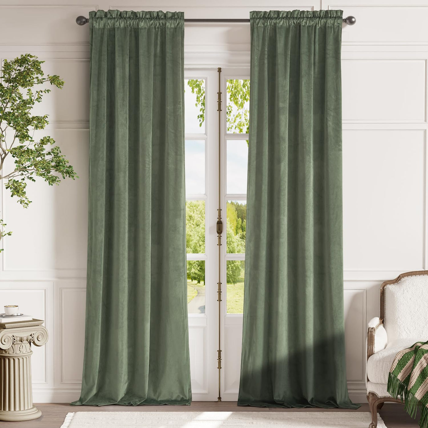 Lazzzy Velvet Curtains Sage Green Thermal Insulated Drapes For Bedroom Living Room Darkening Window Treatments Super Soft Luxury Rod Pocket 96 Inches Long 2 Panels, W42 X L96