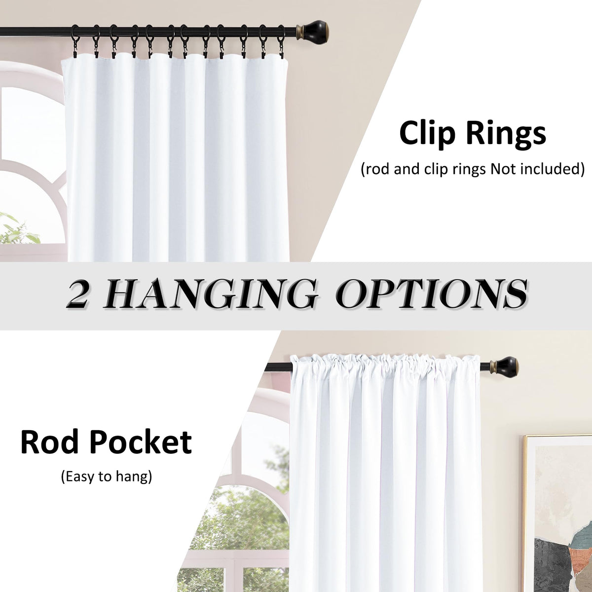 Each curtain panel have 3' rod pocket slot top with 1' header, universal fit to most of rods.
