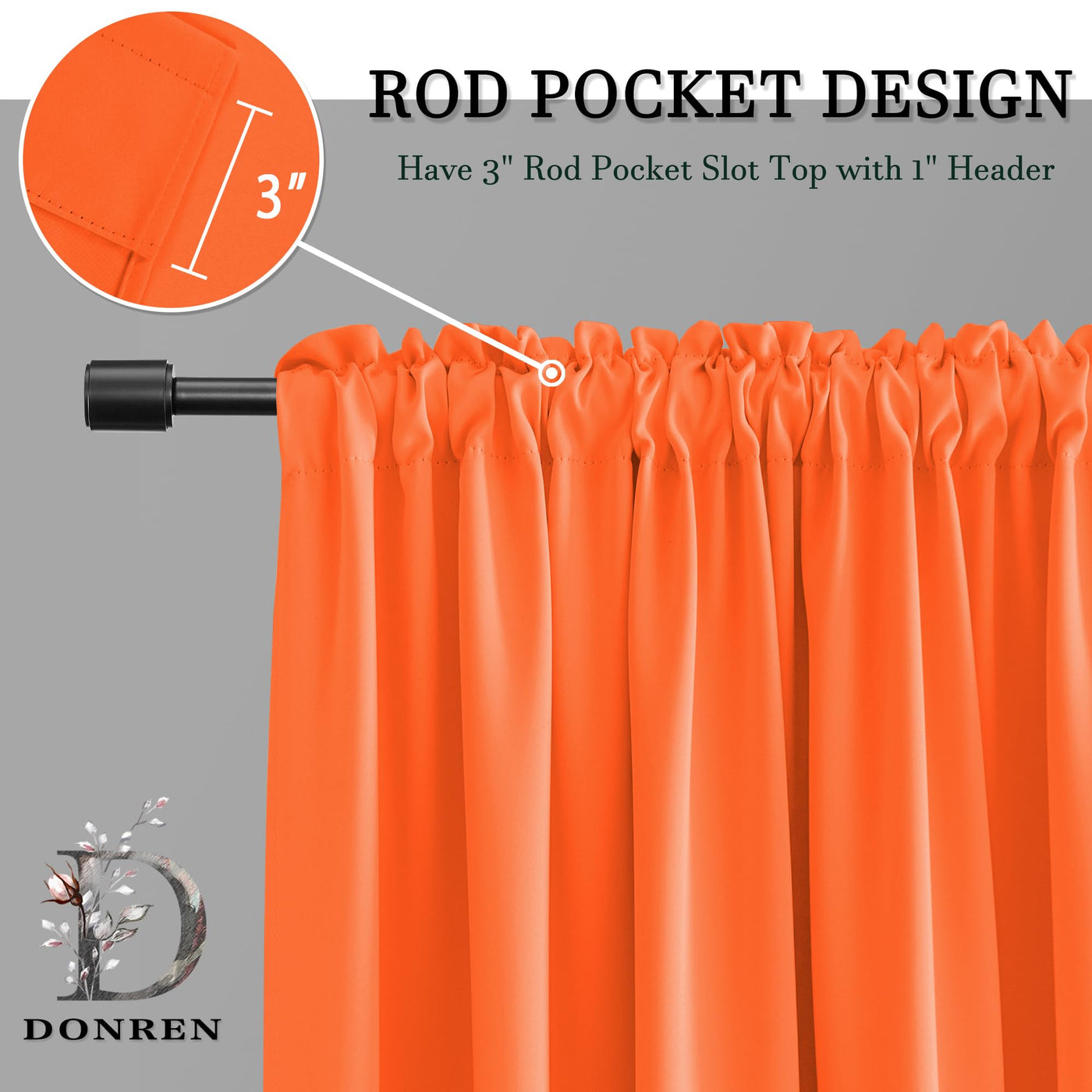Each curtain panel have 3' rod pocket slot top with 1' header, universal fit to most of rods.