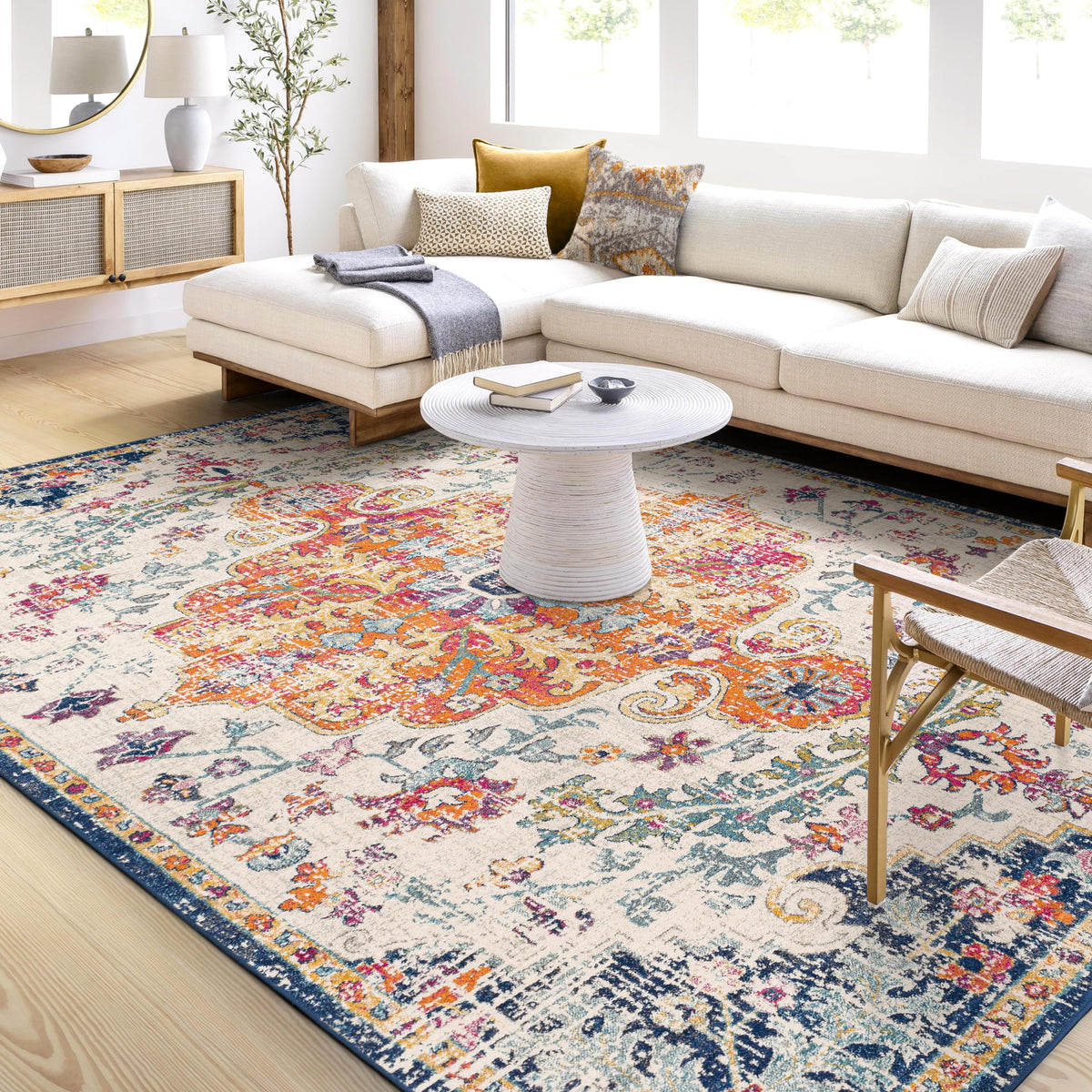 Q: What color variations does the Artistic Weavers Odelia rug come in?A: The Odelia Vintage Bohemian Area Rug features a vibrant orange and navy color scheme, which adds a pop of color and style to any room.