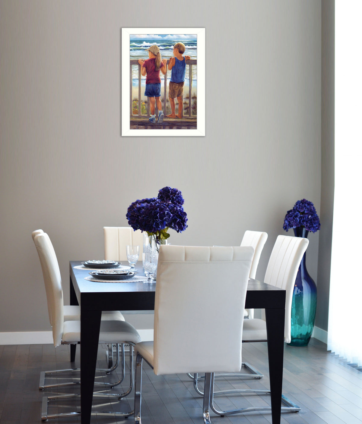 Unique and decorative, this looking over the rail white framed print wall art will leave a lasting impression. This print is a visual artistic expression that allows you to decorate your space in reproduced for you on paper, this hanging decorative accent will be a trendy and fashionable way to dress your walls. Adding this hanging wall art to your space to make your room feel more finished and attractive. Instantly liven up your space with this art that brings color dimension to your home. 0' H x 1 4' W x 1' D