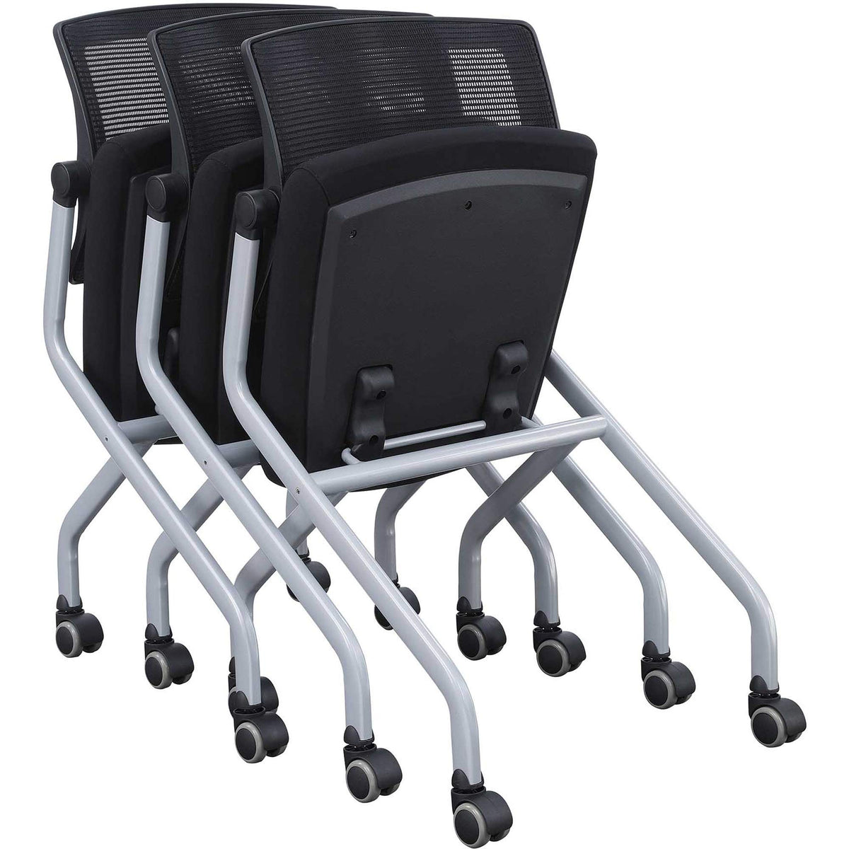 Mesh back chairs with no arms tilt, fold, stack and nest for use in breakrooms, meetings and more. Articulating back lets you lean back for added comfort. Plastic back frame is upholstered with nylon mesh fabric for breathability. Plywood seat is cushioned with foam and upholstered in fabric so you can endure long meetings better. Nesting chairs also include padded armrests, glides and 55mm dual-wheel hooded casters. To nest, simply flip up the seat for compact storage. Stack up to seven chairs. Frame is made of metal. Training chair includes glides and casters to suit your needs. Weight capacity is 275 lb.