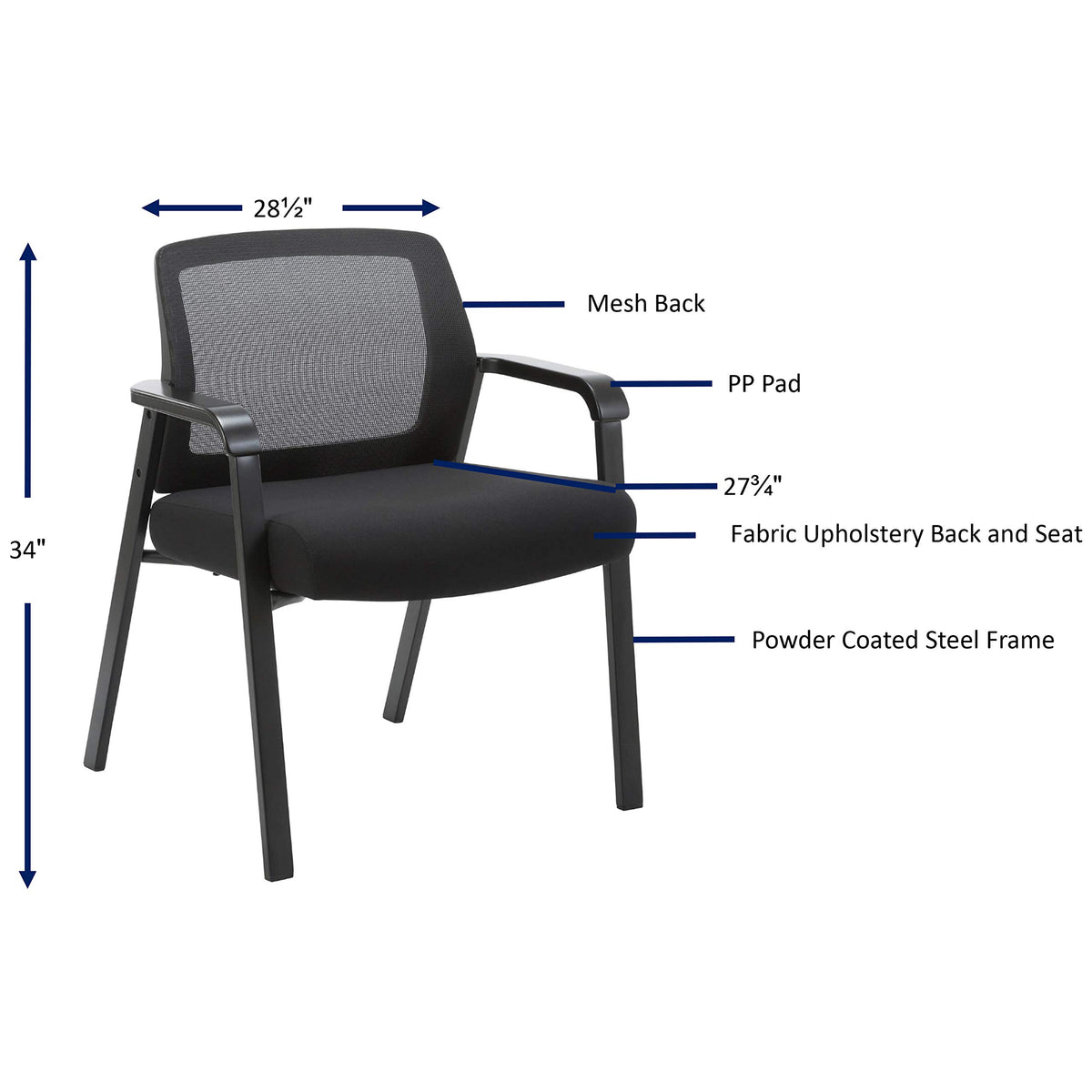 Big and Tall capacity for more general use Breathable mesh back for increased airflow Thick seat cushion for comfort Powder-coated steel frame for durability Professional-looking design Manufacturer Lorell Manufacturer Part Number 67003 Brand Name Lorell Product Line Big & Tall Product Name Big & Tall Guest Chair Marketing Information Comfort meets dependable stability with this Big and Tall Guest Chair. Low mesh back offers breathability for a cooling experience. Thick seat cushion is upholstered in fabric. Sturdy steel frame is powder-coated for a long-lasting professional look. Arms are topped with polypropylene pads. Weight capacity is 400 lb. More from the Manufacturer Packaged Quantity 1 Each Product Type Chair Chair/Seat Type Guest Chair Maximum Load Capacity 400 lb Seat Material Fabric Seat Feature Cushioned Upholstered Back Type Low Back Back Material Mesh Frame Material Steel Features Comfortable Sturdy Long Lasting Color Black Height 34" Width 28.5" Depth 37.8" Recycled No Assembly Required Yes Country of Origin China