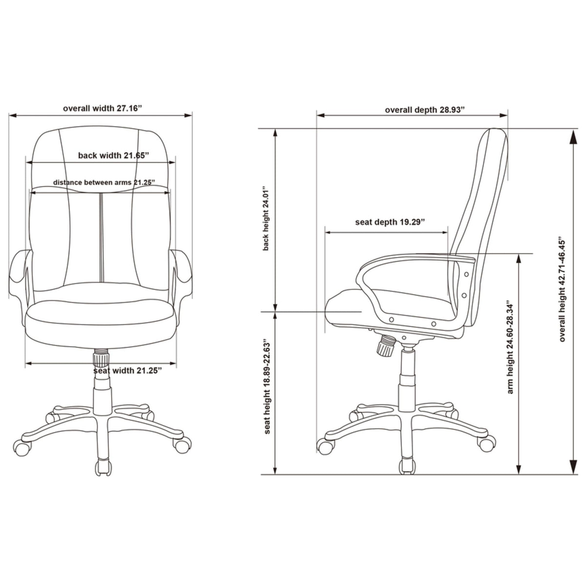 Executive high-back chair offers a fully upholstered design with black, split leather for a rich classic look. Black frame has stylish open loop arms and five-star nylon base with casters for mobility. Functions include pneumatic seat-height adjustment, 360-degree swivel, tilt and tilt tension. High-back chair meets the CA117 fire-retardant standard.