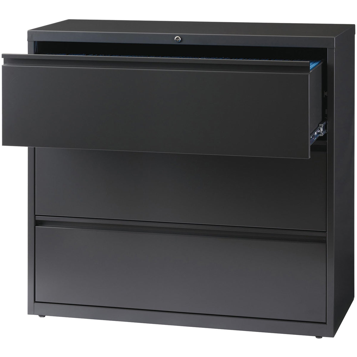 42" wide lateral file features three versatile drawers with hanging file rails for side-to-side filing in letter-size, legal-size, or A4-size. Each drawer has a magnetic label holder for easy identification where you need it. Design also features a core-removable lock for security, dual locking bars, full-width pull, ball-bearing slide suspension for smooth opening and closing, reinforced base, and four adjustable leveling guides for stabilization. Interlock system prohibits the extension of more than one drawer at a time for your safety. Counterweight prevents tipping. Lateral file meets or exceeds applicable ANSI/BIFMA standards.