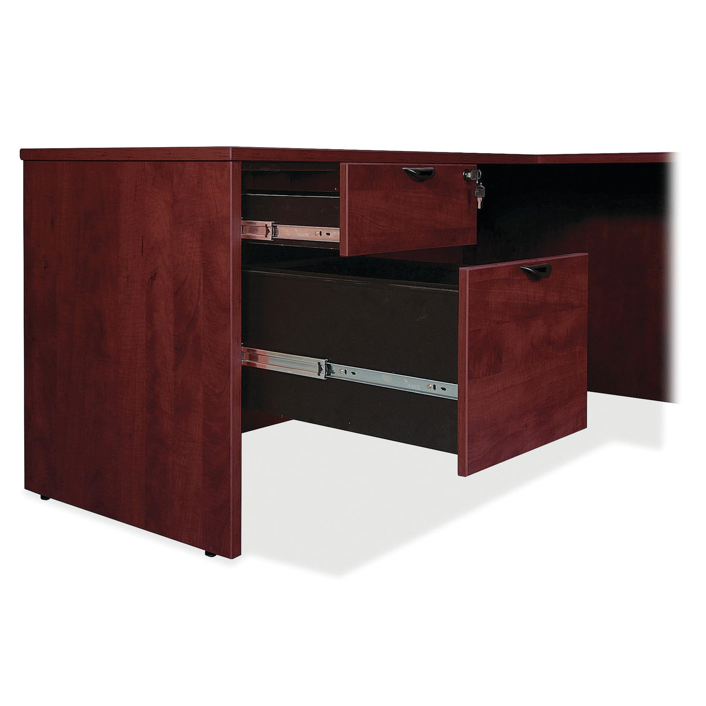 Prominence 2. 0 Series Offers An Elegant Design That Is Perfect For Your Executive Office Suites. Durable, Mahogany Laminate Surface Is Mar-Resistant, Burn-Resistant And Impact-Resistant To Withstand Hectic, Daily Work Life. The 1" Thick Tops Feature Matching 3Mm Edgebanding And Are Manufactured With 45 Lb. Density Particleboard. All Surfaces Are Finished On Both Sides With High-Performance, Thermally Fused Melamine. All Desks Standard With Full-Height Modesty Panels For Privacy. Pedestals Have Locking Drawers To Secure Files And Supplies. Box And File Drawers Have 100 Lb. Full-Suspension, Ball-Bearing Slides. Lateral Files Feature An Anti-Tip Mechanism; Full-Suspension, Ball-Bearing Slides; And Locks For Security. All Units Have 3/4" Adjustable Glides To Remain Level On Uneven Surfaces. Grommets Are Standard On Returns And Bridges For Convenient Cord Management. All Items Are Shipped Fully Assembled Except The Bridge And Conference Tables.