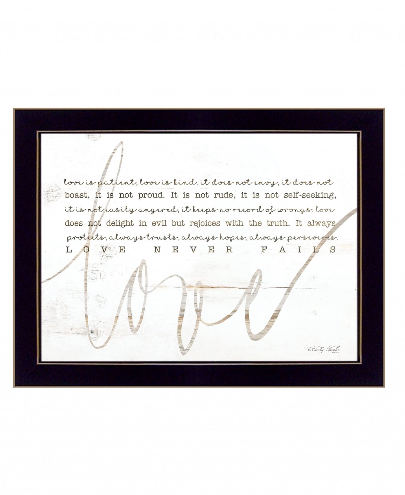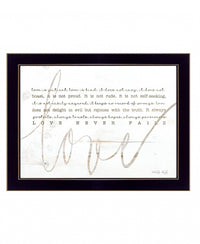 Bring some sizzle to your space with this eye-catching love never fails 1 black framed print wall art. This print is a visual artistic expression that allows you to decorate your space in restyle. Reproduced for you on wood, this hanging accent will be a trendy and fashionable way to dress your walls in a rustic and modern farmvibe. Adding this hanging house art to your space to make your room feel more attractive. Instantly liven your space. with this art that brings Color and dimension to your walls. 14' H x 18' W x 1' D.