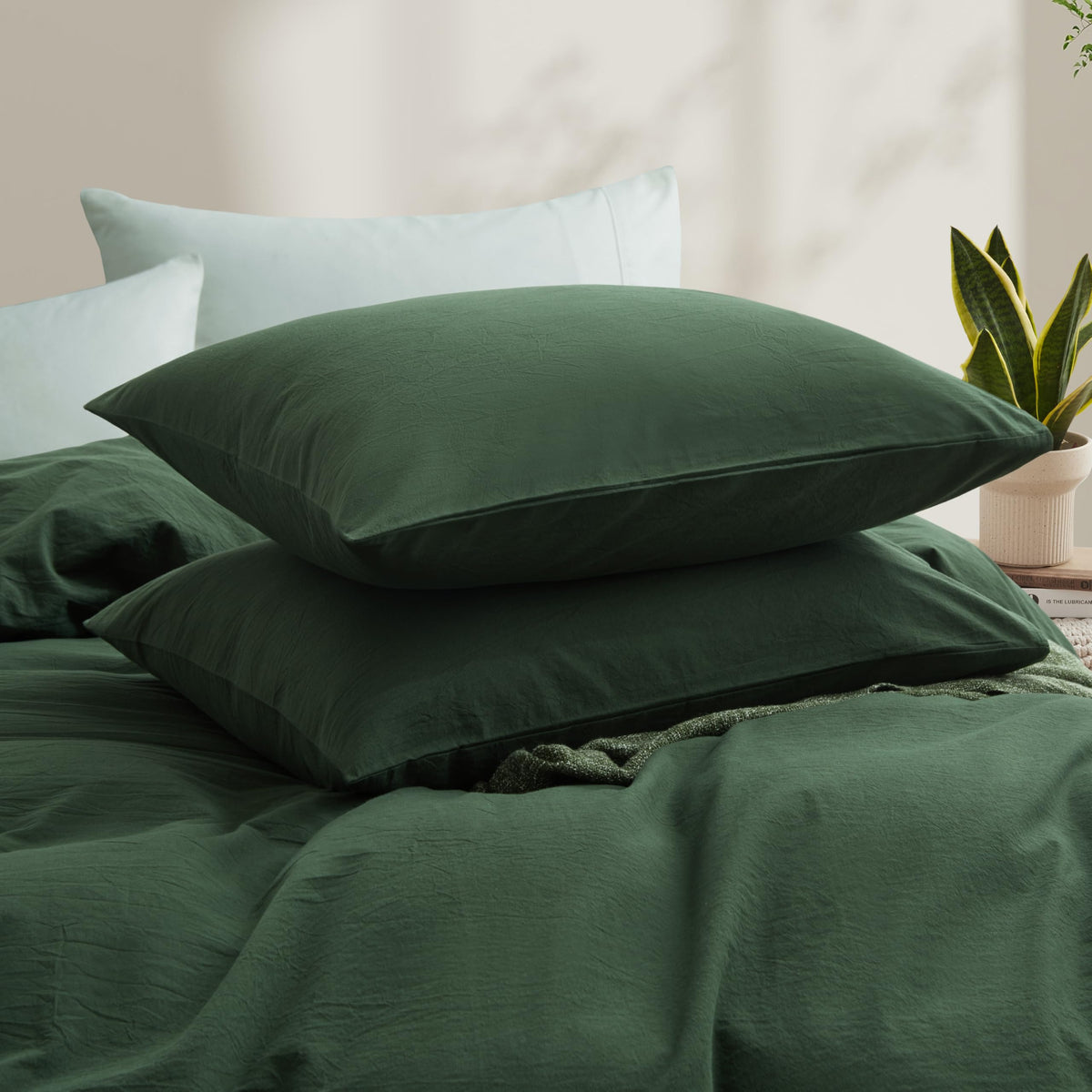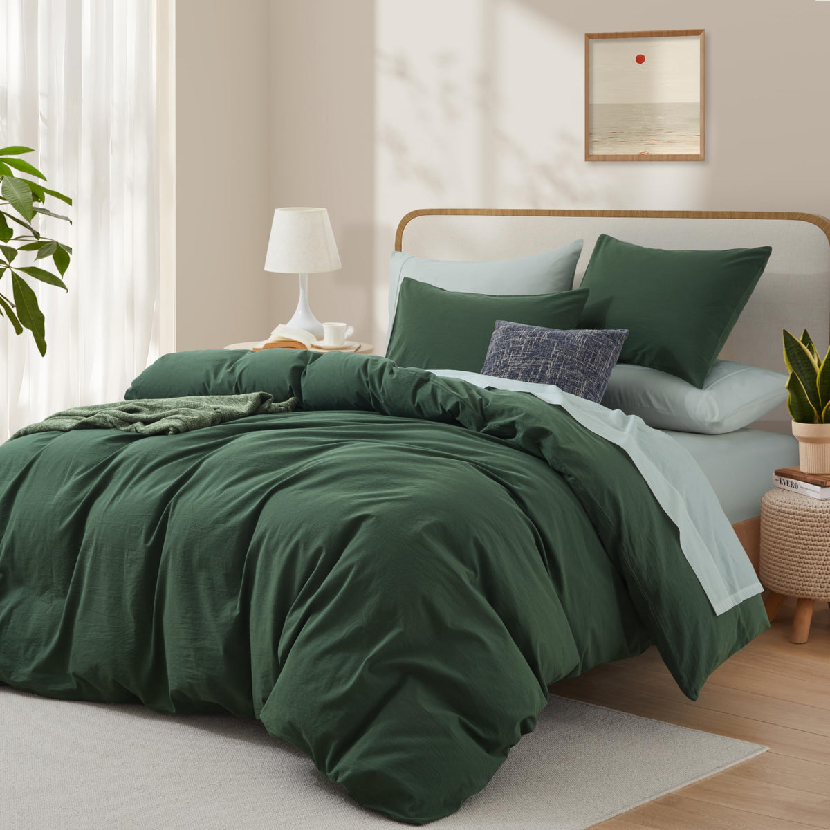 Green Duvet Cover Twin Size, 100% Washed Cotton Linen Like Bedding Set With Zipper Closure (No Comforter), 68X90 Inches, Forest Green