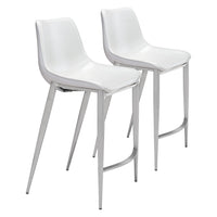 High design meets everyday casual. This handsome counter chair with its slim profile pulls up perfectly to the bar. Its super comfortable curved seat is covered in white faux leather with dramatic stitching. Brushed stainless steel legs are complete with protective plastic feet to keep your floors scratch-free.