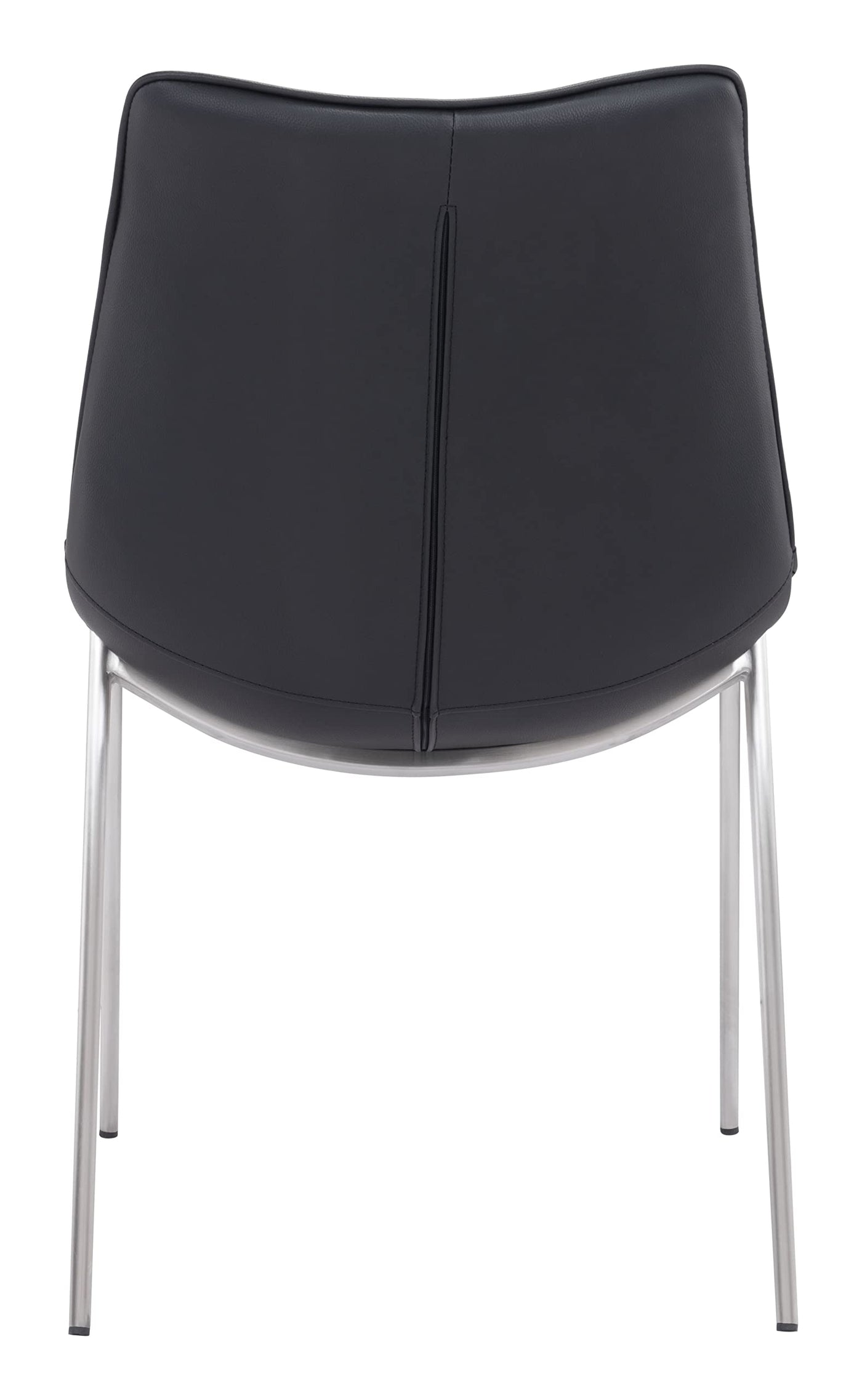 This armless contoured chair with its simple silhouette can dress up your dining space or keep things casual. Beautifully stitched design on black faux leather keeps an eye on the details. Comfortable enough to use as a desk chair. Brushed stainless steel legs are complete with protective plastic feet to keep your floors scratch-free.