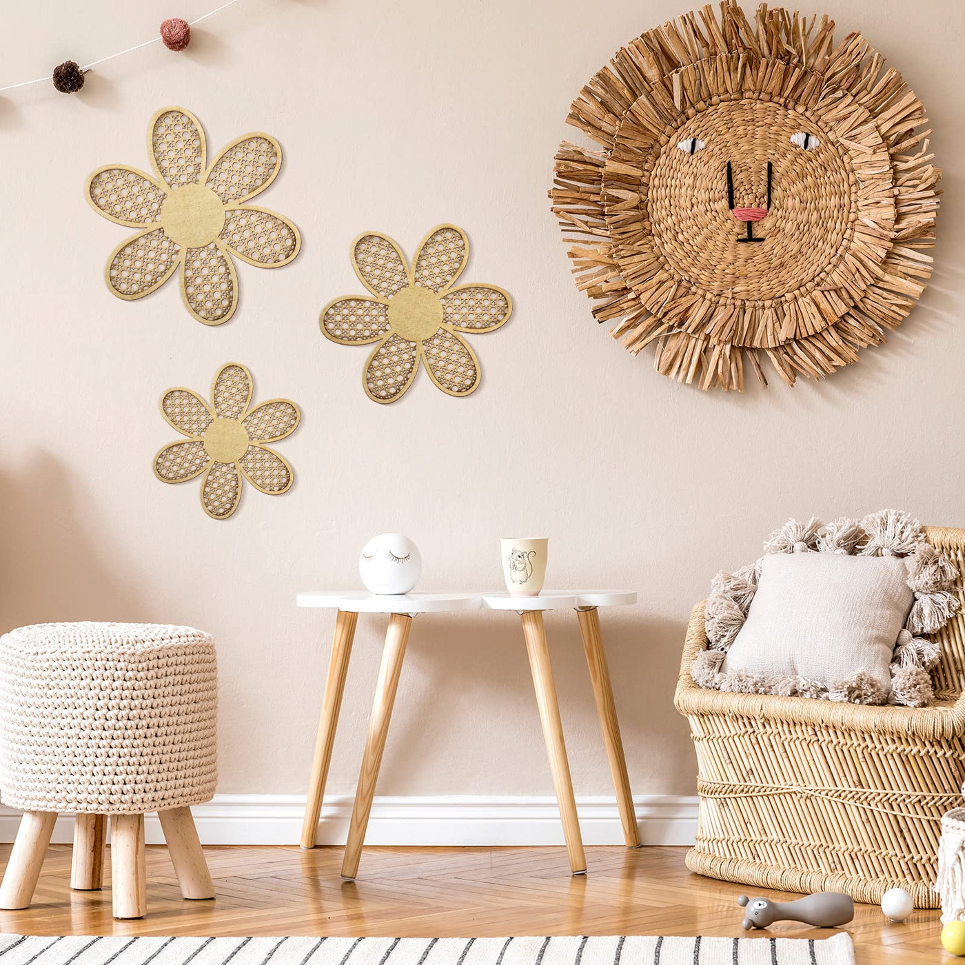 Maitys 3 Pieces Boho Daisy Wall Decor Natural Rattan Flower Wall Hanging Art Wooden Boho Wall Art Nursery Wall Decor Flowers Far