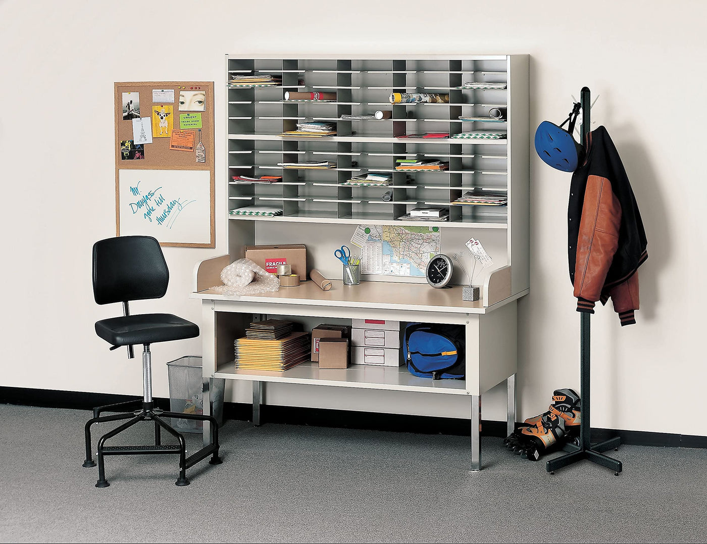 Optional 60" wide x 30" deep pebble gray Mailflow-To-Go Kwik-File Under Table Shelf for 60" wide work tables features durable steel construction. Sits in fixed position 11-7/8" below table work surface. Perfect when extra bulk storage is needed.