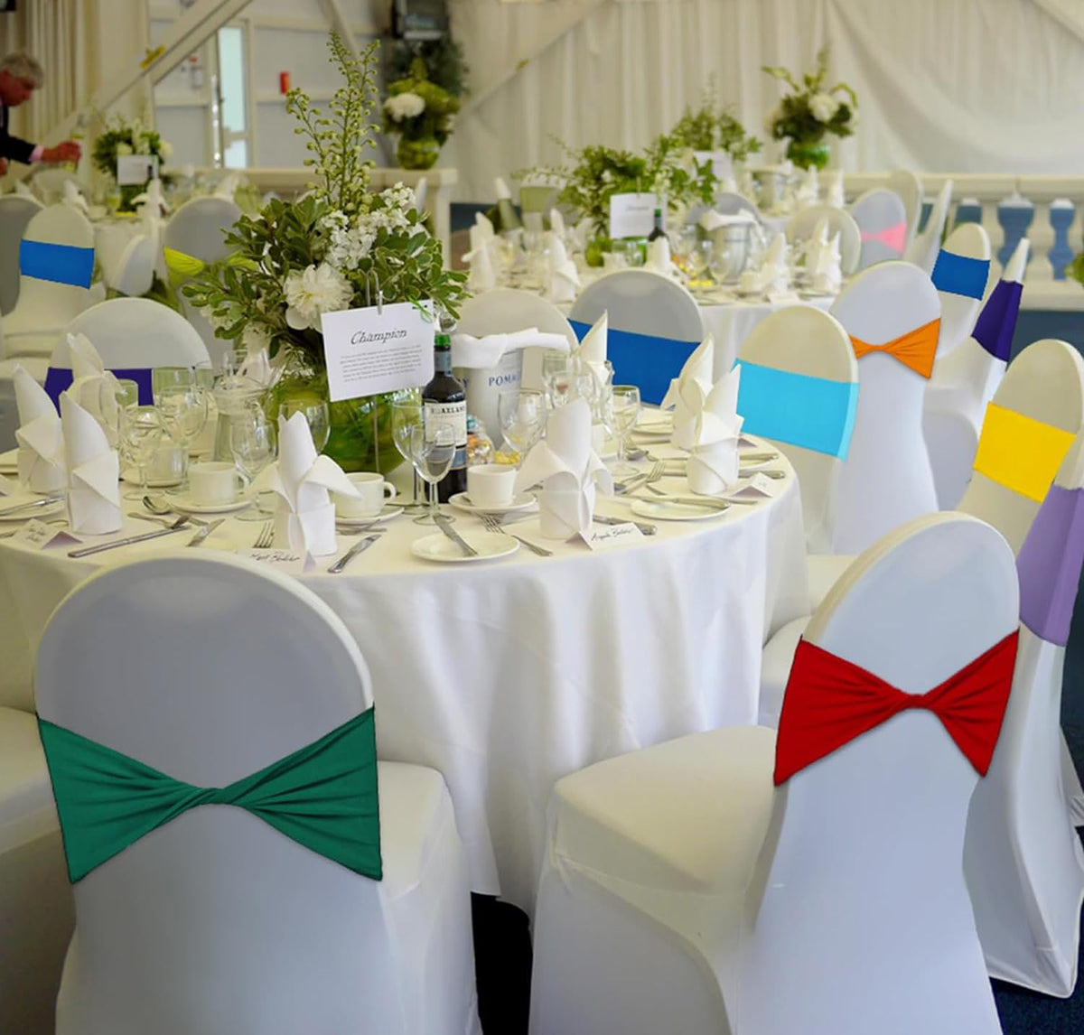 Q: Are the chair sashes easy to use for decoration?A: Yes, these chair sashes are designed for easy use, with a built-in bow-knot shape on one side, allowing for quick and simple decoration of your banquet or party chairs.