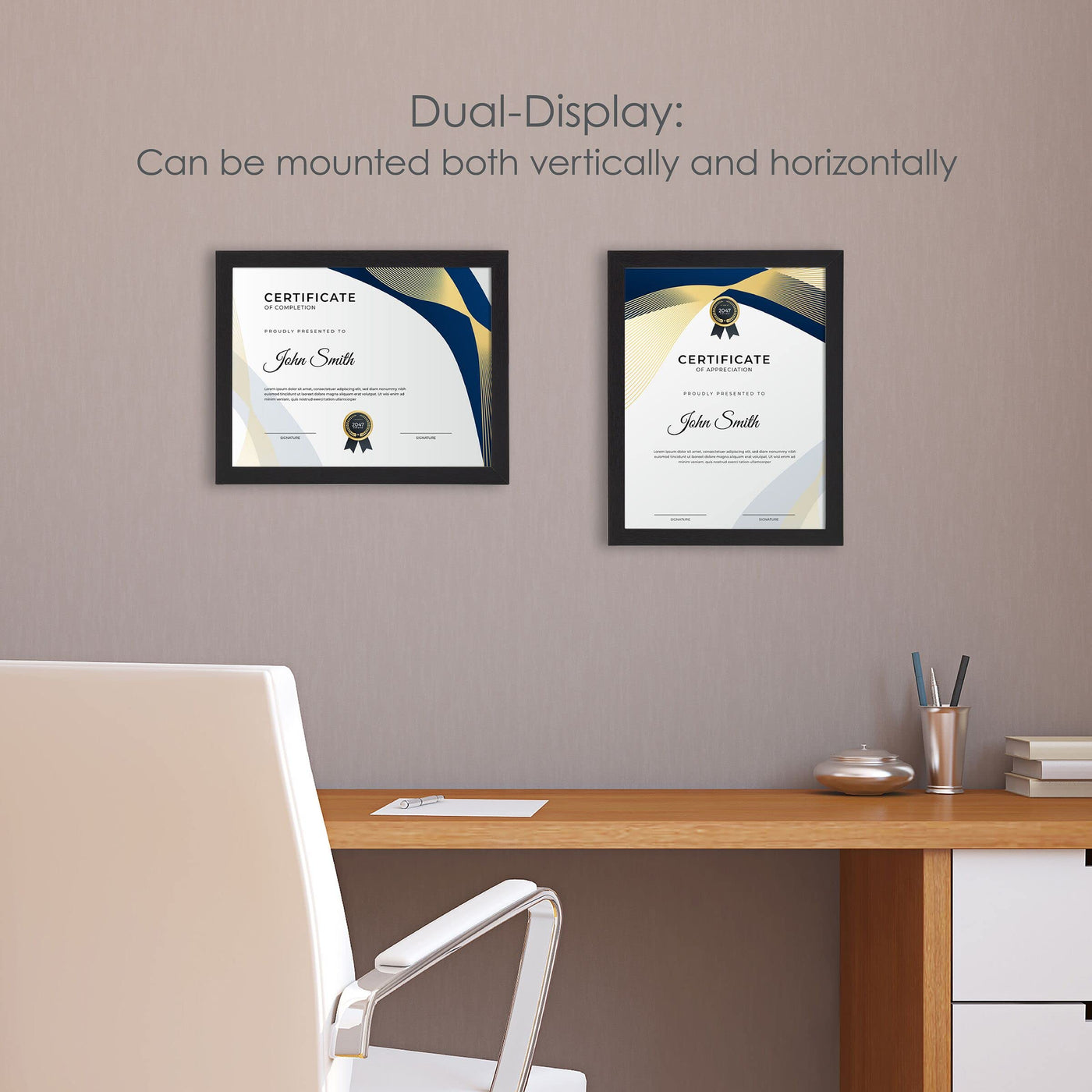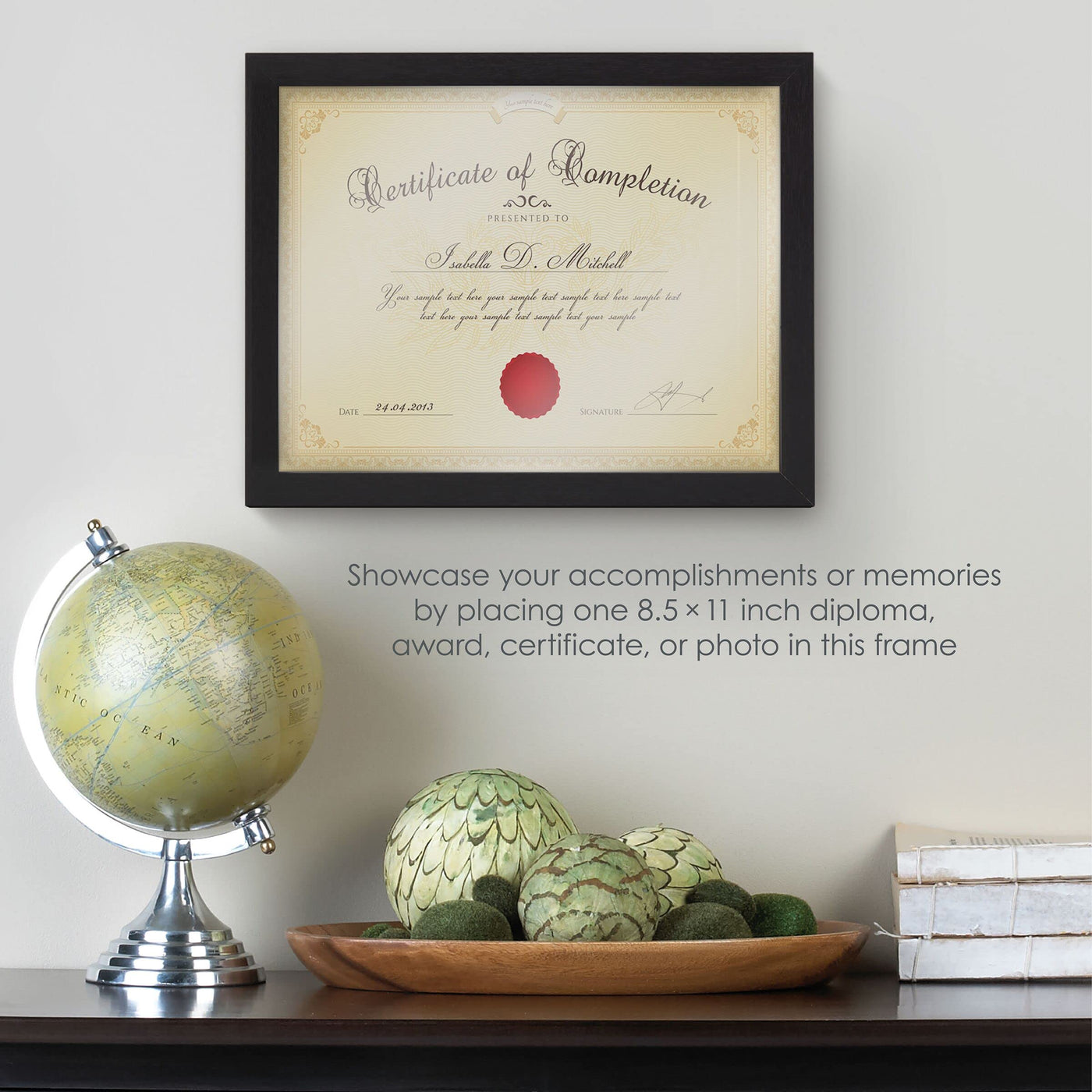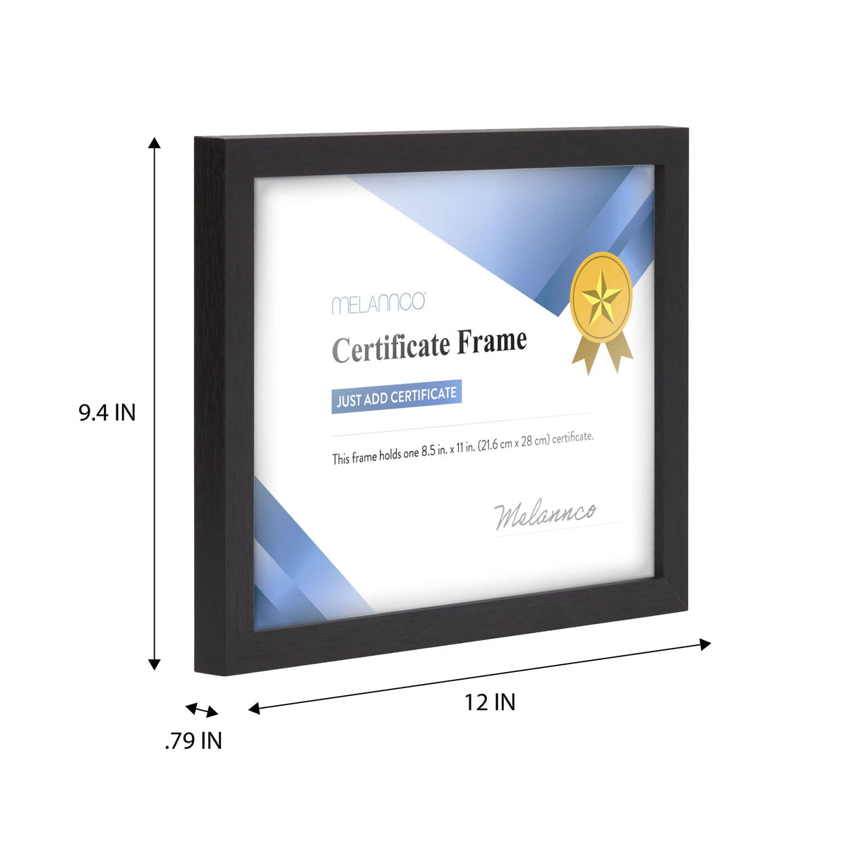 Q: What size documents does the Melannco frame accommodate?A: The Melannco 12x9.4 Inch Black Wood Certificate Frame is designed to display one 8.5 x 11 inch document, which makes it perfect for diplomas, awards, certificates, or photos.