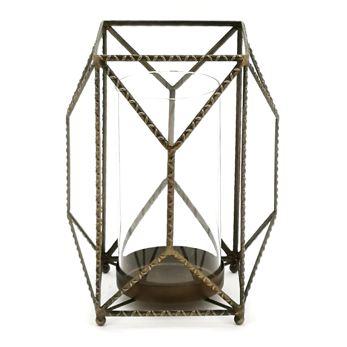 Add a chic-antique touch to your home with this stunning Iron Candle Holder. The chic golden finish paired with the modern geometric frame is the perfect combintion to create a stylish display. The quality iron metal composition with delicate glass insert are sure to last for seasons to come. Illuminate the piece by adding a real wax or LED candle to the glass hurricane. Candle sold separately, this piece best fits a 3' pillar candle.